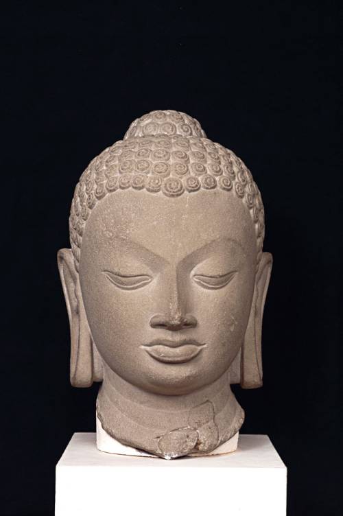 This magnificent sculpture, just a part, the mere head of an image seated in meditation for, as suggests the bearing on the face, it reveals neither the tough determination of his conflict against Mara - the evil power obstructing him from attaining Enlightenment nor the teacher's zeal his face reflected when putting the wheel of Law in motion, the other usual forms of his image, represents the Buddha in strange fullness of meditative being. The half closed eyes indicate self-absorbed contemplation, the essence of his form in meditation. An exceptionally simplified form not going into many details but discovering the Great Master just in some broad features the image has been carved from a block of buff sandstone, beautifully finished and polished, quarried from Chunar, the most finely grained sandstone anywhere in India in use since Mauryan era, the famous Ashokan columns being made of Chunar stone.
