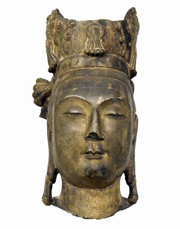 Stone head of bodhisattva. Hard dark stone. Life size. Narrow oval face with half-closed eyes and tiny mouth; no urna; long ears with pierced lobes and earrings; three peaked headdress with tassels partly missing.