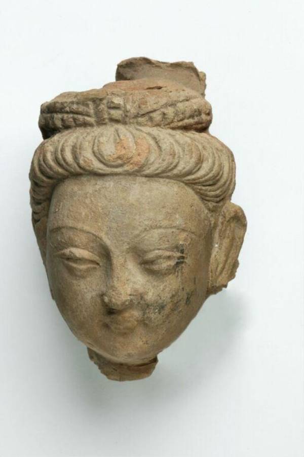 This is a stucco relief of a Bodhisattva figurine. The face is full and round, with fat creased cheeks and a small chin. The bowed lips are small and full. The small nostrils are sharply cut. The corners of the mouth are deeply dimpled. The nose forms a straight line with the forehead and is narrow-bridged and sharp. The arched eyebrows are long and narrow. The prominent eyes have broad lids which are almost closed. The hair is parted from the centre and loosely drawn back under a fillet, making crescent shaped curves towards the ears. The fillet consists of a band of square beads between plain borders. Everything above the fillet is lost, as is the right ear and the rest of the body but the head. The left ear is damaged. It was excavated at the major Buddhist (cave) temple site at Ming-oi which literally means “the Thousand Dwellings”, a term not solely confined to this specific site, but also to other temple sites. It is located close to Karashahr on the northern branch of the Silk Road in Xinjiang, China. In the almost one-hundred Buddhist shrines at the site, many pieces of delicately carved heads, torsos and busts were brought to light.