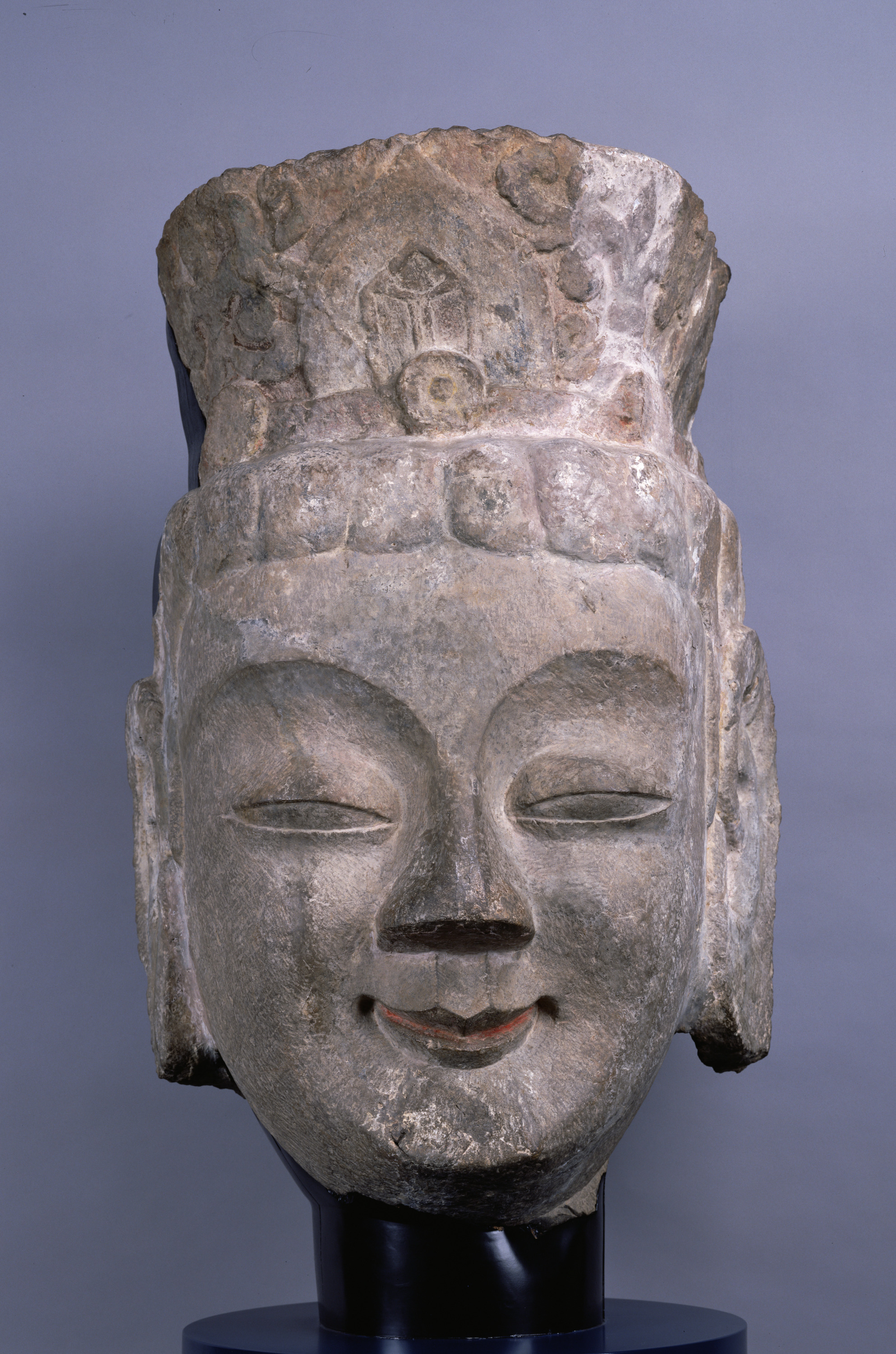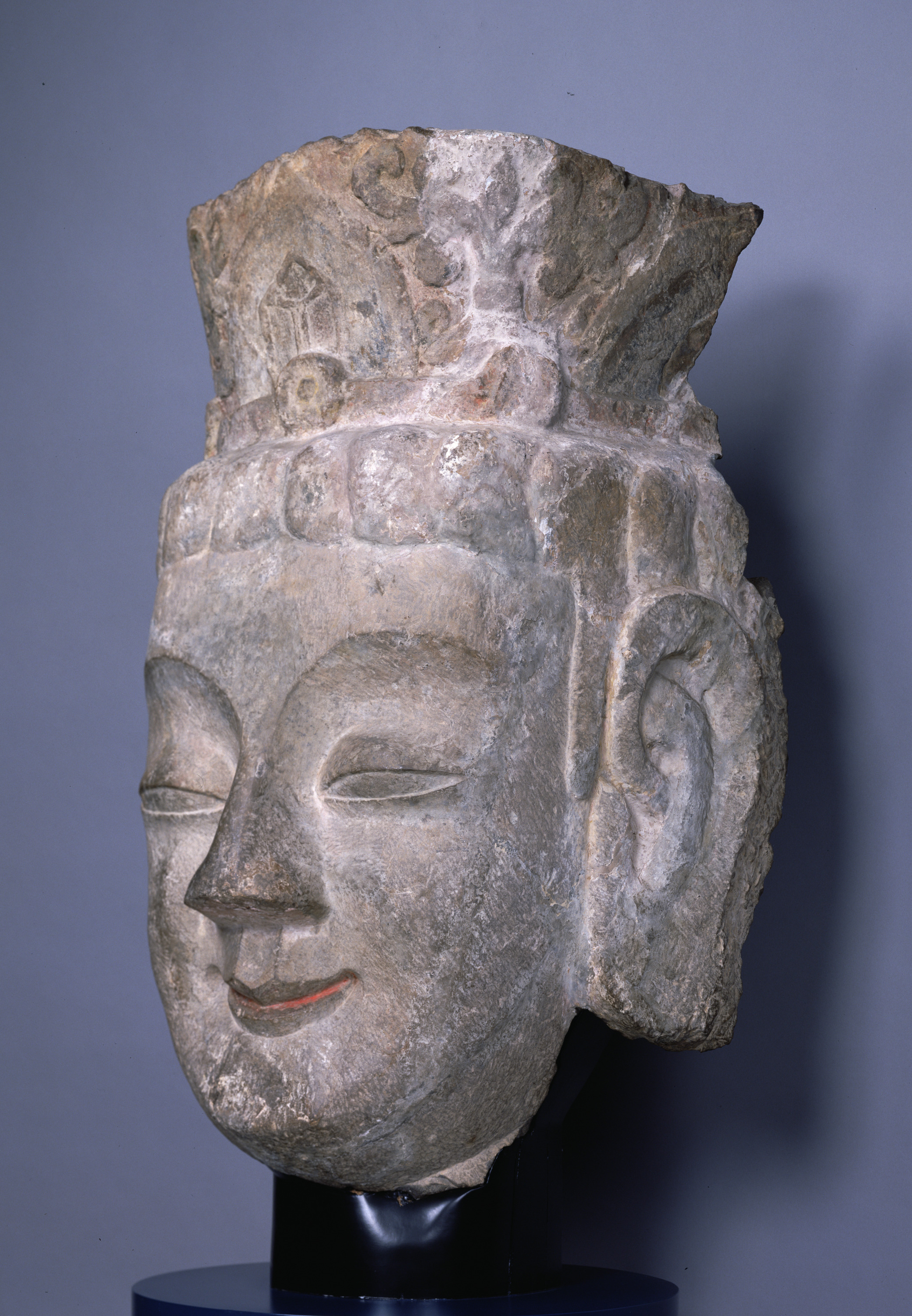 This bodhisattva head is from one of the caves that a Northern-Wei emperor ordered to construct. Its almond-shaped eyes and distinctive smile were typical traits of Northern-Wei sculpture.