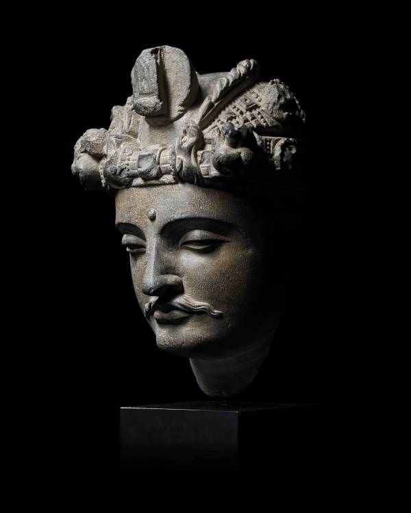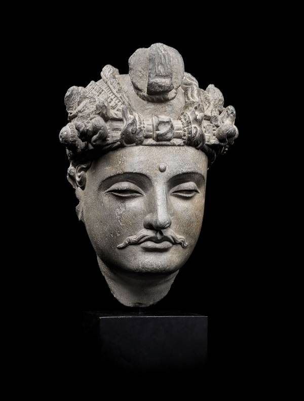 Encompassing Northeastern Afghanistan and Northwestern Pakistan, the ancient region of Gandhara benefited from the unique hybridity of early cultures. Displaying in its sculpture elements informed by the Mediterranean, Near East, India, and Central Asia, its artistic products are wonderfully cosmopolitan. The elaborate turban worn by this handsome Bodhisattva has no direct comparison to Indian or Sasanian models but retains elements of large faceted beads, thick fabric bands, and fantastical beasts at the sides, represented in other examples published in Tissot, Gandhara, Paris, 1985, figs.171-83. Also compare to a bodhisattva head in the Los Angeles County Museum of Art published in Pal, Indian Sculpture, vol.I, Los Angeles, 1986, pp.168-9, no.S46. The present sculpture is very finely carved and finished with smooth polish over the stone's fine grain.