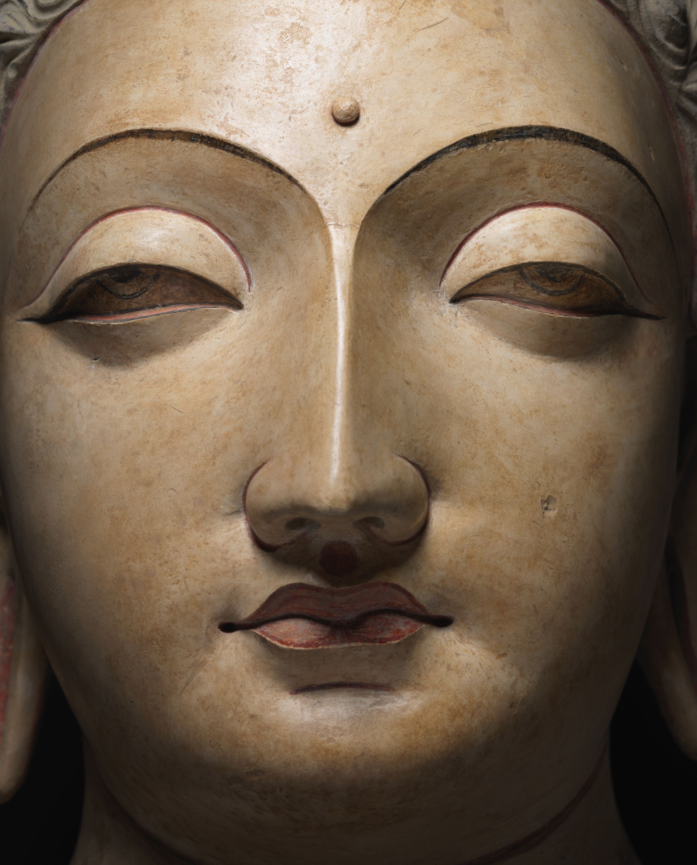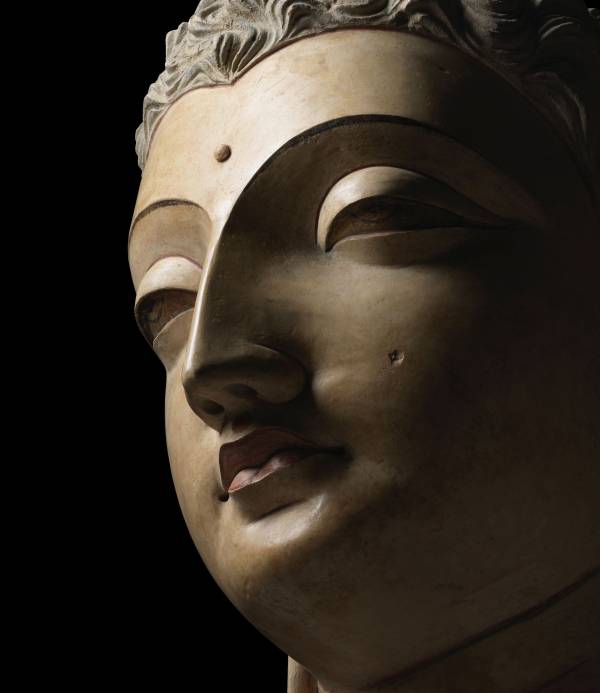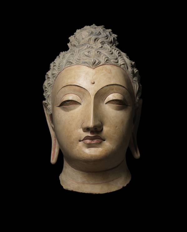 儘管在過往兩千年的中亞,犍陀羅灰泥雕像飽受自然環境侵蝕和政權更迭的影響, 此件佛首卻得以保存其近乎原貌的細緻與完美。藝術家精心塑造的波卷髮紋得以保存下,從佛陀的美人尖發散到頂髻,最終收於兩耳,線條自然流動。此外,原本的彩繪裝飾留存幾近完美:鮮紅色的朱砂突出了髮際線、鼻翼跟雙唇,厚重的黑色線條穿越其眉峰,並勾畫出雙眼。佛陀雙目眼瞼低垂,寓意智慧超凡,不受世俗塵垢之汙。