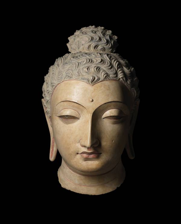 3,000,000-5,000,000港元 可設想在古代絲綢之路上現今的阿富汗境內有一座曾經宏偉壯觀的佛塔,佛塔中有一尊巨型佛像,而本拍品便源自這樣一尊佛像。佛首體量大,品相完好,展現現存最早期及最具影響力的佛像雕塑傳統之一,同時也見證了一千五百年前的佛教聖地的繁榮。此尊或為存世不多的兩三件大型頭像中品相最好的一件。