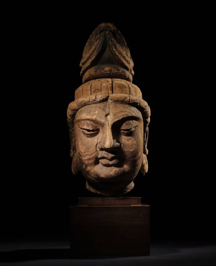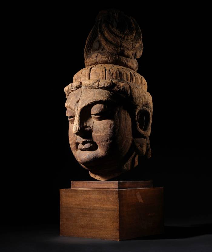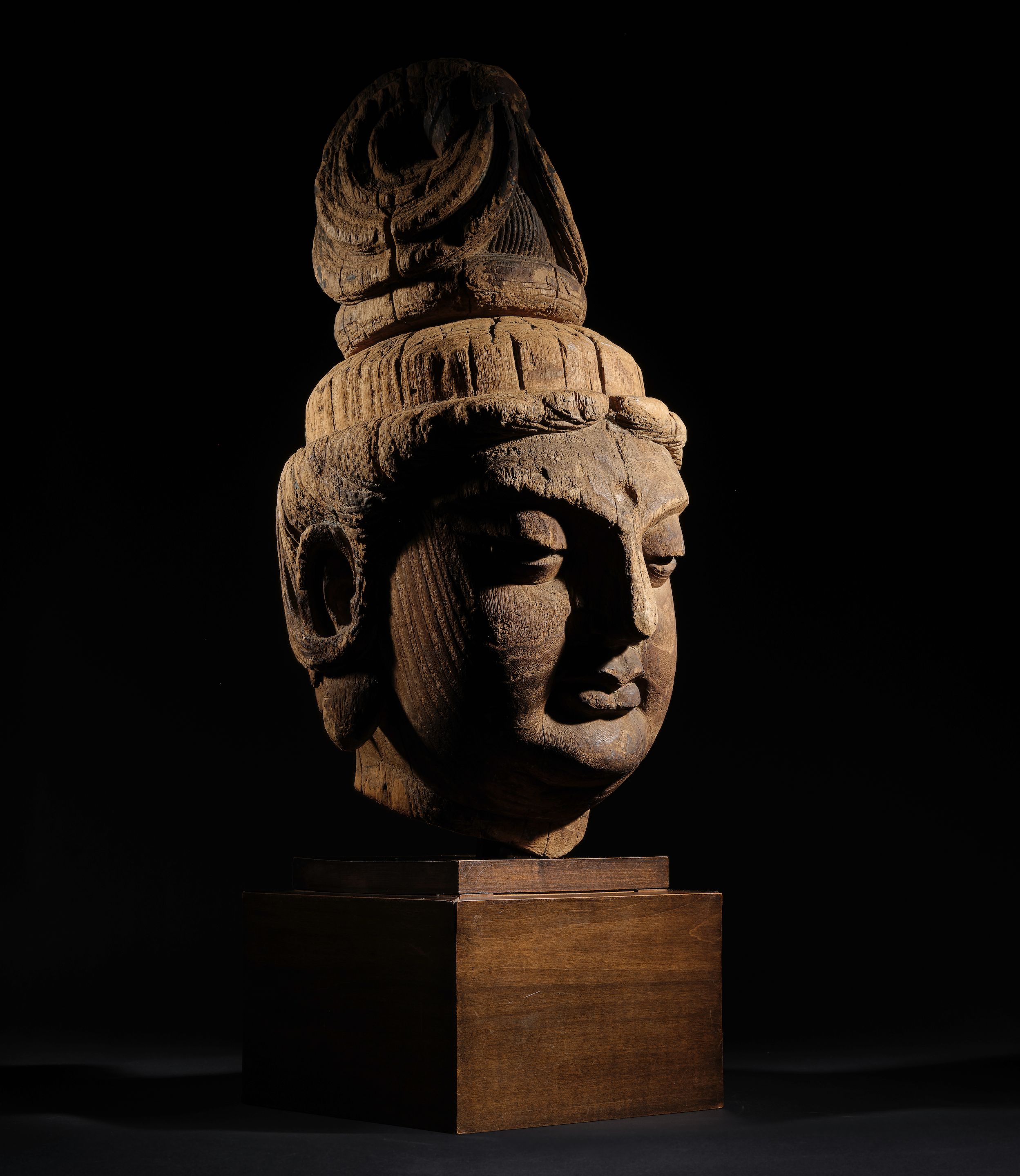 This monumental and exceptional wood head, representing the Bodhisattva of Compassion and Mercy, exquisitely carved in the round, skillfully captures the serenity of Avalokitesvara and exemplifies the zenith of Chinese Buddhist sculpture. The visage features full, rounded cheeks and downcast eyes adorned with luminous black glass pupils, which have remarkably retained their original luster, evoking a deep sense of compassion and introspection. The elegantly arched brows curve gracefully like crescent moons above a central forehead indentation that originally accommodated a jewelled urna. The lips are full and gently pursed, while the pendulous ears are proportionately framed according to canonical standards. The hair is intricately styled in an elaborate, towering chignon that evokes the form of swirling clouds.