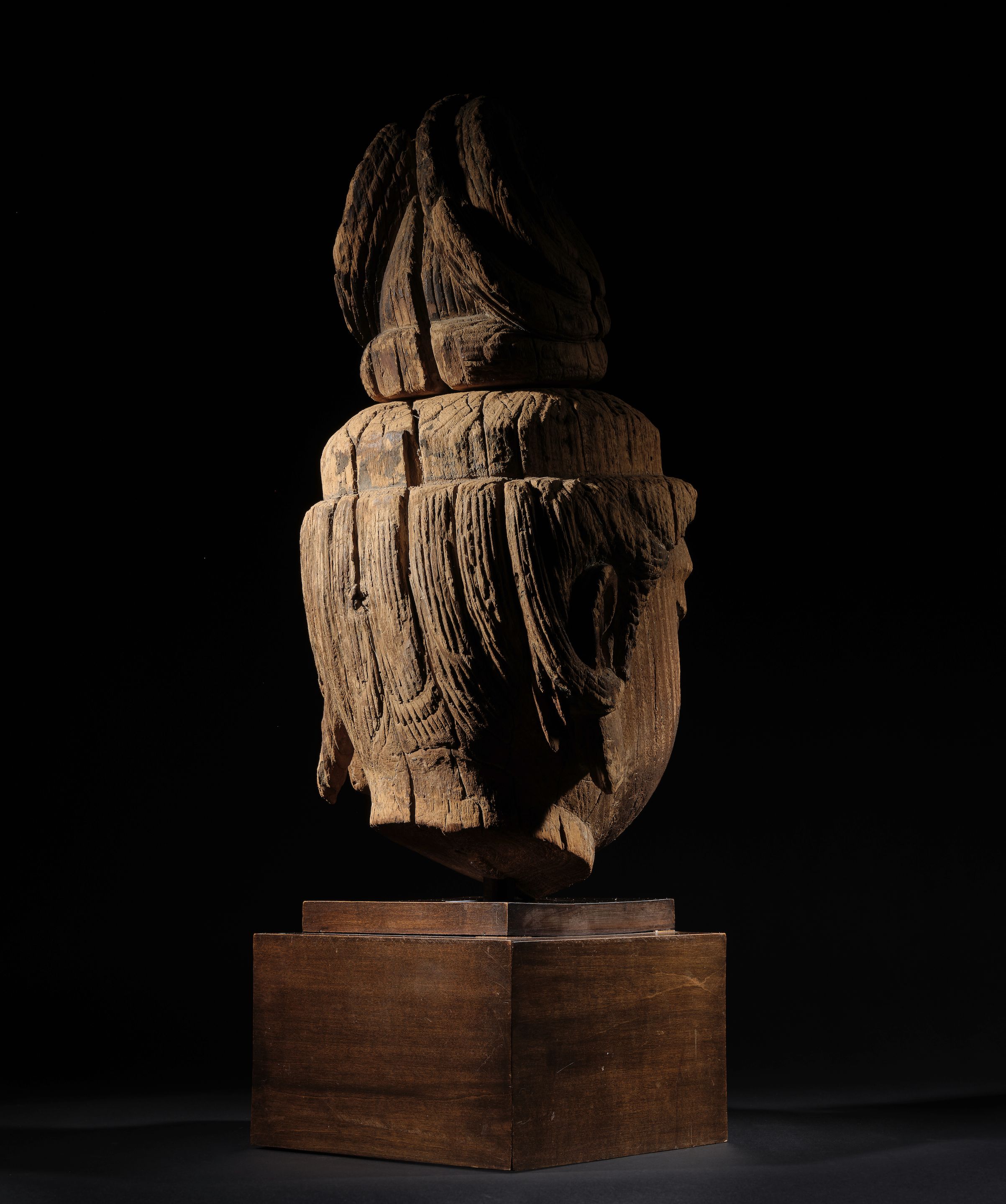 A MONUMENTAL AND RARE CARVED WOOD HEAD OF BODHISATTVA