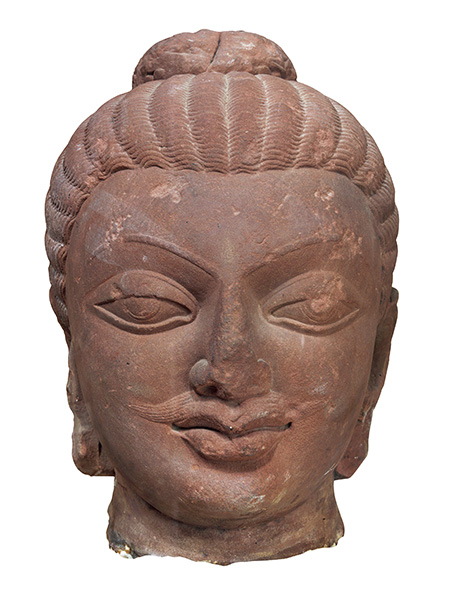 这件佛头因为有肉警方可辨认其为佛像,不过从其发髻和眼睛的表现方式来看明显受到印度教造像的影响,头发是整齐的卷发,有肉髻,眉弓高挑,眼睛半闭,刻出眼珠,梁挺真,皇端略残,嘴唇上方有胡髭,嘴角略带微笑。面部表情显得刚直硬朗,勇武有力,缺少了些沉思冥想的表情。