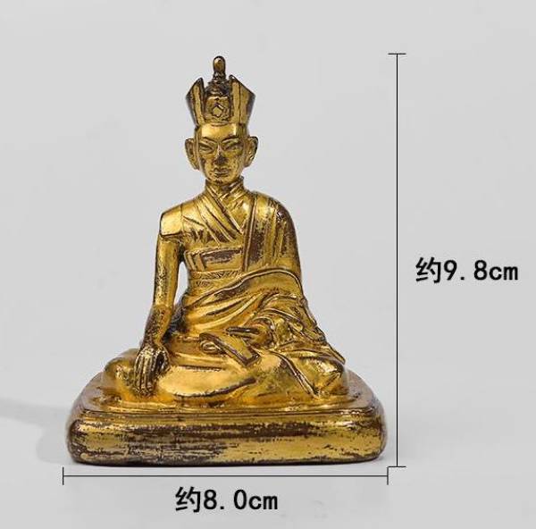 本尊造像从其莹润醇厚的铜质、璀璨靓丽的鎏金,匀称和谐的比例、自然生动的身姿、飘逸写实的服饰来看,都具有极高艺术收藏价值和研究价值。此尊上师头戴噶举派法王帽,面型秀美,颧骨突出,弯眉细目,双眼俯视,表情沉静,相貌塑造十分写实。上师身穿厚重的藏式僧衣,覆裹周身及双腿,外搭通肩袈裟,全跏趺端坐于卡垫之上线条自然流畅,用冰冷的铜将织物轻柔的质感表现的淋漓尽致,上师右手结触地印,左手捧经书结禅定印,这种“释祖成道相”造型的上师像,反映了藏传佛教“视师为佛”的特点。