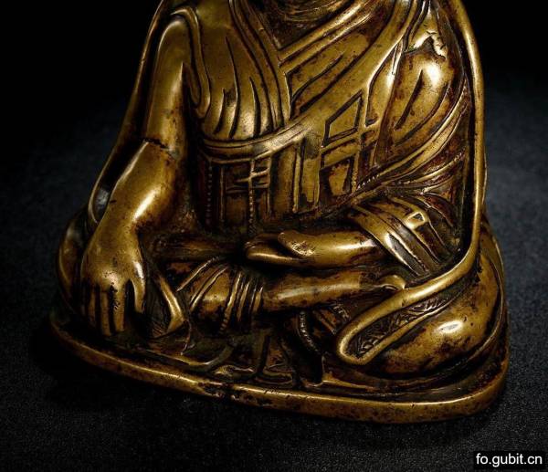 此尊上师像刻画的便是一位中年的帕竹噶举上师,面部表现较为写实,已经完全区别于印度帕拉风格的佛菩萨造像样式;上师头顶微秃,发际线也较高,使得脸型显得略长,高挑眉、深眼窝、目光下视,呈三昧禅定之相,鼻翼丰厚,嘴唇厚实,嘴角微微上扬,整体面部主要以刻画线勾勒五官,如以密布的分隔号表现下唇与下巴之间的过度部分,手法十分质朴!右手作触地印,左手于腹部作禅定印,双足结金刚跏趺坐于薄薄的座榻之上;内着宽松覆肩坎肩、百衲袈裟,外披大氅,袈裟表面和各层衣缘均细细刻画,顺畅的纹理表达显得极为华丽!!最最值得一提的是,本件上师造像为原装藏,极为殊胜!总的来看,整尊造像做工精良,细节刻画入微,铜质细腻,包浆莹润古朴,能流传至今十分难得,且品相上佳,具有重要的艺术价值和收藏价值!