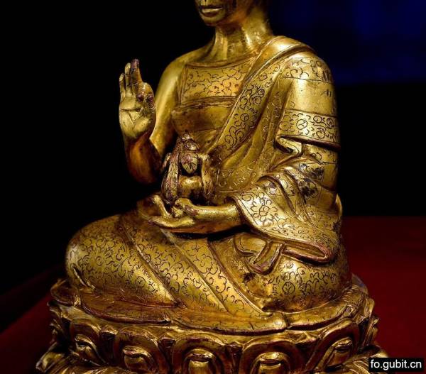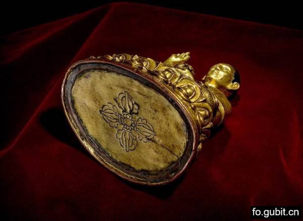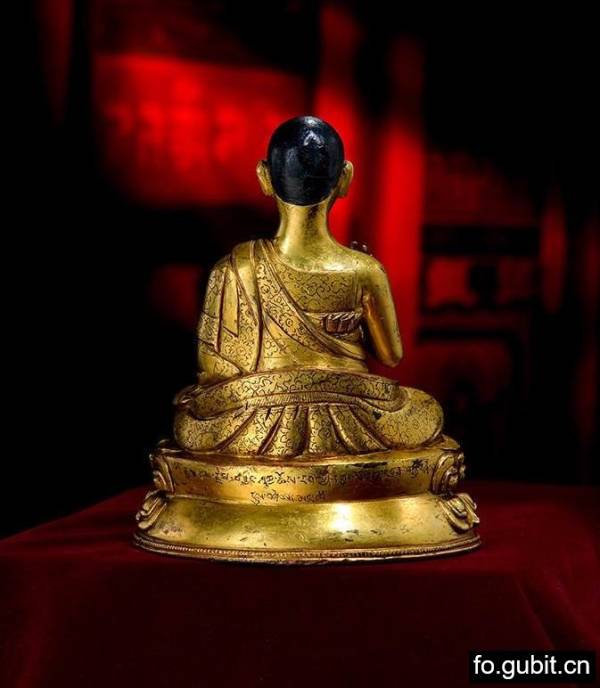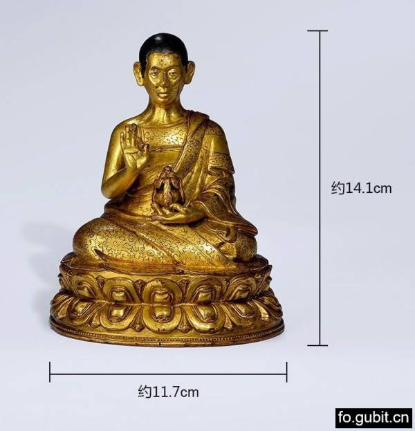 此尊上师造像非常精彩!!面颊非常瘦削,颧骨微凸,眼窝深陷,相貌极具个性化特征!额际高广,发际线如弯弓,头顶漆黑、表黑色短发,修眉炯目,薄唇微合,颈间颈筋显露,表情刚毅自持,神形兼备,形象生动写实!身披袒右肩袈裟,僧坎也较为特别,整个服饰还细致装饰,满满錾刻花纹,工艺繁复,奢华精美!衣纹也写实自然,十分注重表现衣饰的层次关系和衣褶纹路的起承转合,对于锦缎厚重的质感也刻画得入木三分,既能感觉到内在身体的真实存在感,又体现出衣服自然垂下的走势,十分到位!不过其雕琢的精细也透露着造像者对上师无比崇敬的心态!上师身体端正,躯体结构比例均称,坐姿挺拔,微微右倾的头部与庄严的面部表情形成依托,悲悯的情态表现油然而生,恰好与富有动势的肢体相配合,准确地抓住了上师点化摄受众生的动态瞬间!四肢修长而柔软,手脚的刻画也非常细腻,特别是手指关节、指甲的细节处理更是一丝不苟,柔软而富有弹性,充满了灵动的生命力!右手置于胸前结说法印,左手结禅定印托长寿宝瓶轻轻置于袈裟上,双腿结跏趺坐,下承束腰仰覆式莲花座,双层莲瓣宽大舒展,瓣尖微翘,上下对称规整排列,在颗颗连珠的点缀下更是美观大气!最最值得一提的是,莲座背面还有铭文,大致可翻译为“嘉瓦傑松夏嘉卻剌,七十八歲壽時所造之像,吉祥!”并且莲台下还有完好的装藏,封底中心刻十字金刚杵图案,严实的包底、牢固而有效地护卫着内膛的装藏,使其继续保有神秘的宗教灵性与加持法力!此像整体尺寸不小、造型也尤为端庄!生动传神的五官、繁复精美的簪花、饱满悦目的金水,生动塑造出了高僧的殊胜品质和尊贵身份!也充分体现出了十五到十六世纪西藏造像的极高的工艺水准!
