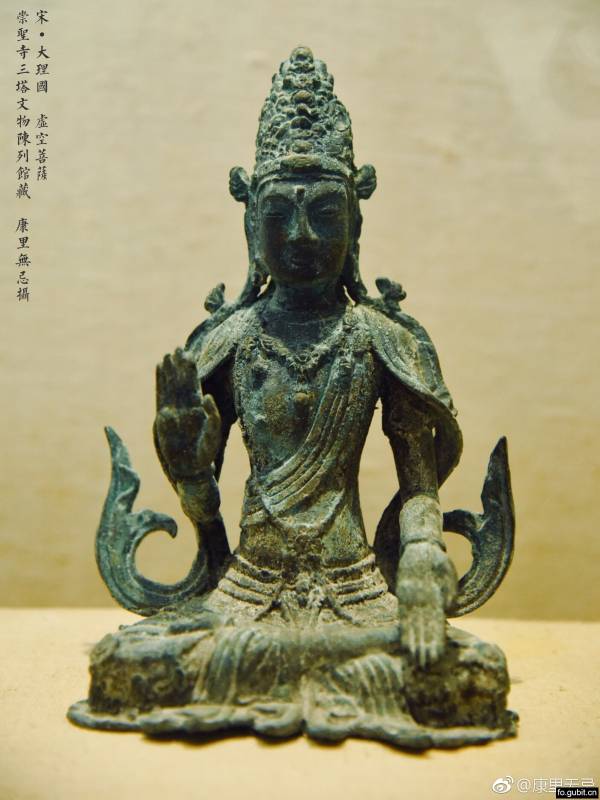 宋·大理国 虚空菩萨,崇圣寺三塔文物陈列馆藏。云南省博物馆收藏了一尊类似的,同是大理出土,写的是“铜鎏金菩萨坐像”,目前没有记载虚空菩萨,倒是有虚空藏菩萨,依《观虚空藏菩萨经》的叙述,此位大菩萨“顶上有如意珠,作紫金色。若见如意珠,即见天冠。此天冠中有三十五佛像现。如意珠有十方佛像现。菩萨身长二十由旬,若现大身,与观世音等。”右手屈臂持宝慧剑,宝慧剑缘有种种色光焰;左手置于腰侧,握拳持宝莲,宝莲上有如意宝珠;坐于宝莲花上。尊上所持之宝珠、宝慧剑,大众认为即表福、智。密号如意金刚。种子为凕。三昧耶形为慧刀。