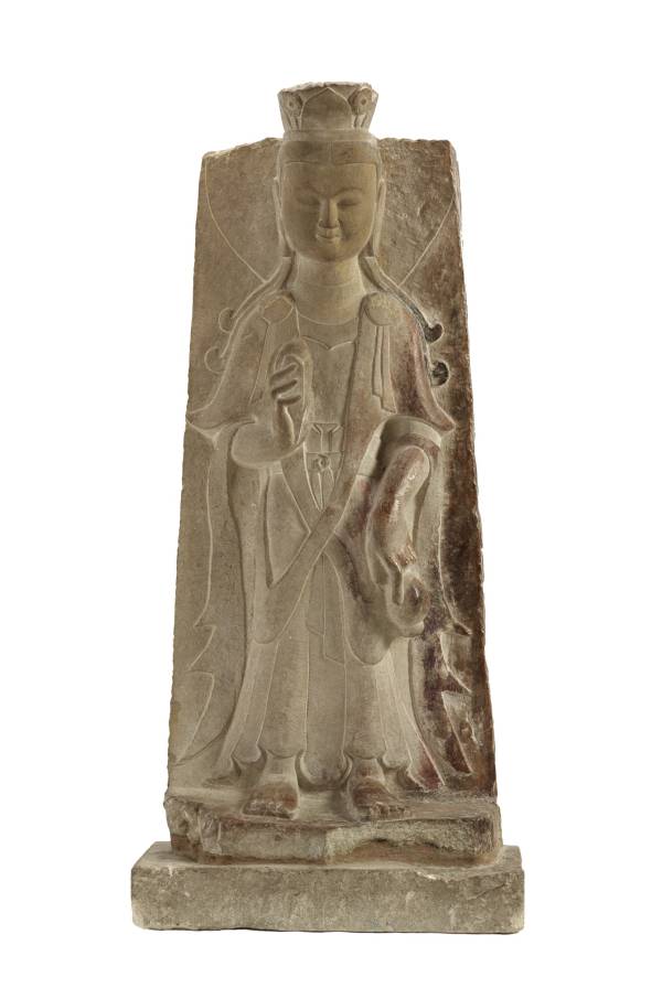 北魏彩绘石雕胁侍菩萨立像,来自于河南巩县石窟第一窟,现藏于弗利尔美术馆。