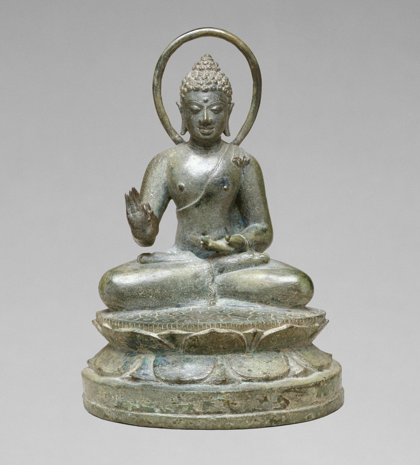 his splendid Buddha is seated on a large double-lotus pedestal in the cross-legged yogic, adamantine posture of vajraparyankasana, the right leg over the left, with the soles of both feet facing upward. His robe is draped to leave the right shoulder bare, and a portion of the garment that covers the left wrist falls behind the figure. The lower hem of the robe comes all the way down so that the undercloth or skirt is completely covered.