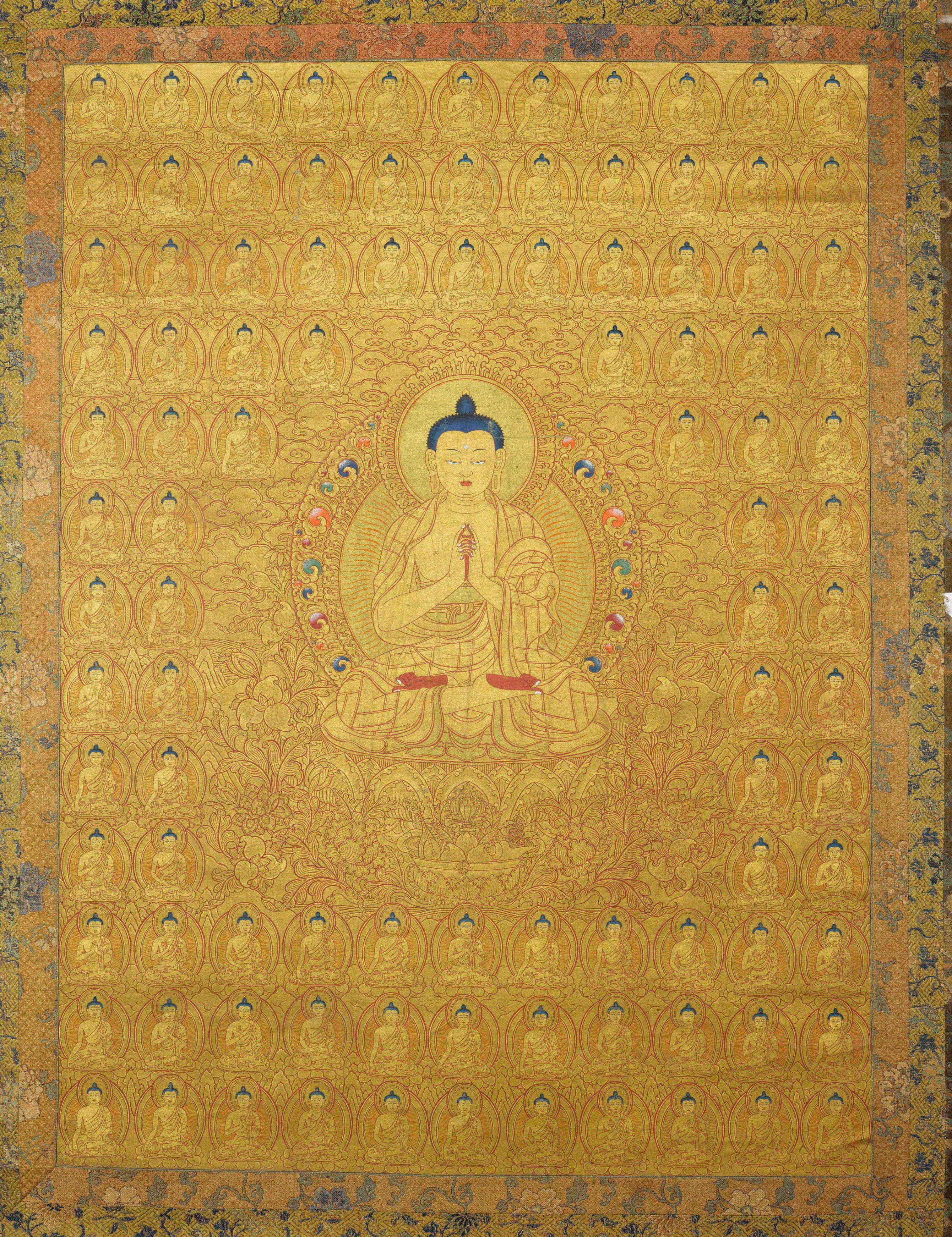 “唐卡中央,大日如来端坐在莲花宝座上,身后背光头光相连成葫芦型,四周镶嵌着五颜六色的珠宝,双手于胸前结智拳印,主尊四周布满排列整齐、结不同手印的小佛像,同样都坐下有莲花,身后有背光。唐卡中心主尊大日如来佛及周围的小佛像皆以金汁细绘,仅佛头、佛掌心脚心和珠宝以彩色颜料描绘,色彩和谐,大气恢弘。整体构图规范,四周小佛像,外观相似,尺寸微小,但勾描精准,每一尊结不同的佛手印,于典雅中传递着庄严神圣的意蕴。