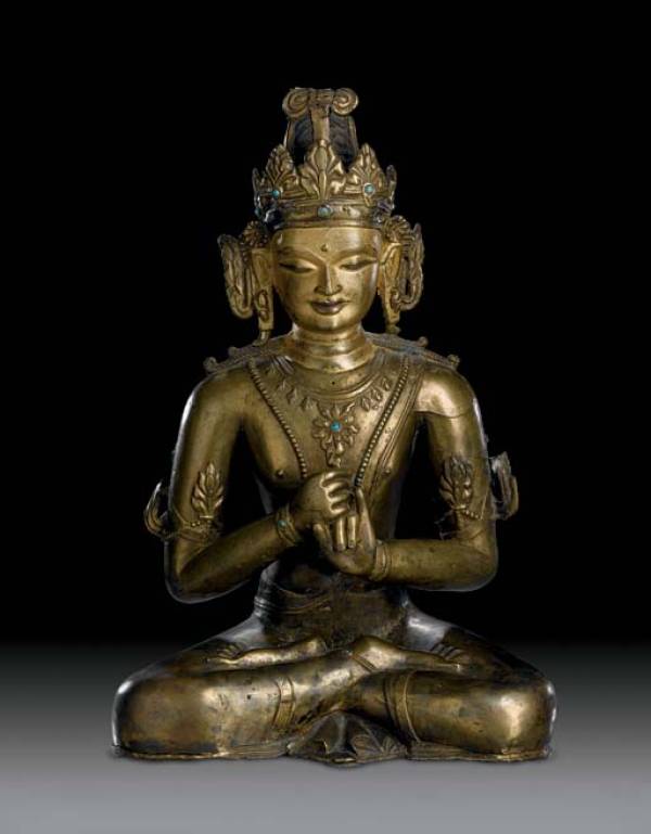 Seated in dhyanasana with hands in front of his chest in his characteristic mudra of holding his index finger, wearing a long dhoti with incised hems and jewelry inlaid with hardstones, the face in a serene expression with elongated eyes and parted lips, the hair piled into a high chignon and secured with a foliate tiara by billowing ribbons, the face with remains of cold gold