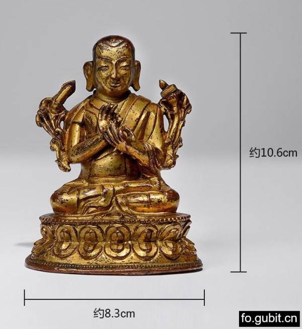 厚足的鎏金,真的是闪闪发光的精致!!!本尊宗喀巴金色绚丽,胎体厚重,工艺精湛,细节处理的一丝不苟,灿烂的金色加上柔和细腻的包浆,仿佛整尊造像都在散发着光芒!大师面庞方正,鼻梁高翘,神态自然,深邃的目光中流露出清澈与智慧的光芒,除了生动的五官之外,面部肌肉也都刻画的惟妙惟肖,使端正的面庞上威严不减丝毫;双手结说法印,双腿盘坐于莲台之上,观其整体神䪨气质俱佳,呈现一副慈爱与智慧的形象;双臂各立优钵罗花枝,花蕾在肩头两旁开放,分别供智慧剑与般若经,利剑表示可以斩杀一切烦恼之贼,经书表示智慧渊博如大海,这与文殊菩萨所持法器一样,寓示宗喀巴大师是文殊菩萨的化身!大师身着交领式坎肩、僧裙和袒右肩袈裟,衣纹写实流畅,衣褶规整具有层次感,点睛加分;其下的双层束腰莲花宝座,花瓣宽大饱满,上下对称整齐排列,挺阔的瓣叶宛若正在开放,上下各饰有连珠问,点缀下的莲座耿直精美,更给人稳固敦实之感!整尊造像上手较重,大师身形比例匀称,铸造线条流畅连贯,刻画规整写实,包浆细腻柔和,金色亮丽饱满,真的是小造像大气势,为难得的十六世纪佛教造像精品!保存非常完好,很是难得…