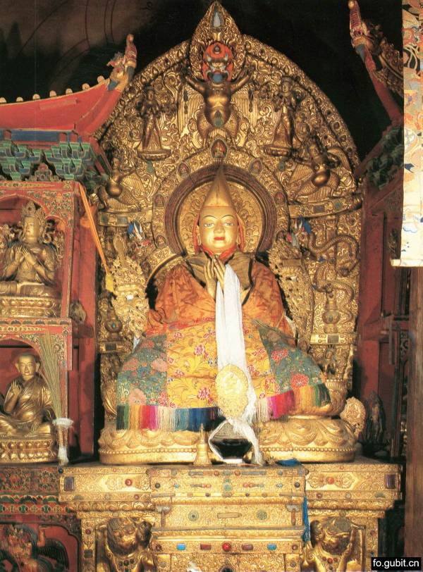 主尊宗喀巴与松赞干布、五世达赖喇嘛像, 宗喀巴像高1.37米,松赞干布像高1.09米: