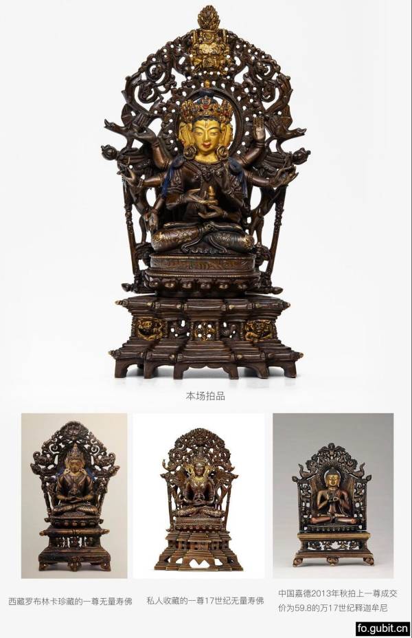 此种装饰手法与西藏罗布林卡珍藏的一尊无量寿佛(图一),国内私人收藏的一尊17世纪无量寿佛(图二),中国嘉德2013年秋拍上一尊成交价为59.8的万17世纪释迦牟尼(图三)非常相似,这四尊作品皆是雪堆白造像艺术的翘楚之作。整尊造像质地细腻厚重,且采用非常罕见的局部鎏金工艺,细节刻画一丝不苟。此像的制作工艺、艺术感染力及其品相在同类造像中可谓十分难得,为同时期雪堆白造像中的极精之作,在当今拍卖市场,西藏“雪堆白”制造的艺术品日益受到收藏家和投资者青睐的情况下,现身龘藏2019年秋季拍卖会,值得重点关注。