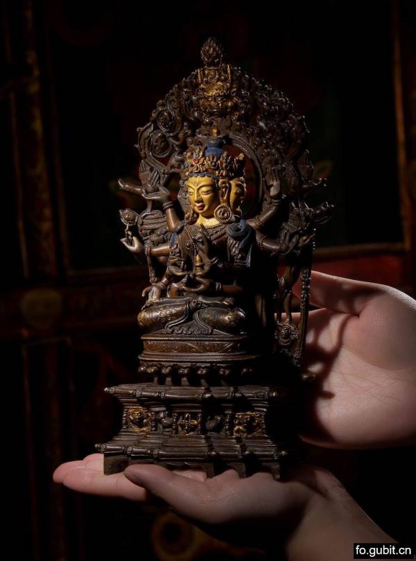 此尊尊胜佛母,整体合金铜铸造,局部鎏金。佛母呈金刚跏趺坐姿,三面均戴五叶宝冠,冠叶雕刻十分精巧,顶结高发髻,上托摩尼宝珠,发髻染绀蓝色,余发垂搭于身体两侧。面上各具三眼,相容端庄圆润,于泥金上施彩绘,五官精致柔美,神态祥和静谧。八臂位置、手势各异,部分持有弓、箭和甘露寿瓶,富于动感,姿态优雅写实。佛母身形结构比例完美,配饰包括耳珰、项链、璎珞、钏镯、腰带等,工艺精巧华丽,上身袒露,下着薄裙,轻柔贴体,裙边在座面铺展开,美感尽显。佛母坐于錾刻精美花纹的蒲团之上,并用三层圆润的连珠纹展示出坐垫的厚重质感。下方圆形莲座端庄华丽,莲瓣层叠有序,具平衡大气之美,下承束腰方形台座,正面镂空雕凤鸟和雄狮背驮台座的形象,姿态生动,彰显造像的尊贵地位。身后背光最上方为火焰摩尼宝和支巴扎神兽,下为鸭子,主尊左右两侧为站立的狮羊神兽,鸭子尾部生出的缠枝纹刻划的栩栩如生,将所有的元素全部联系起来,整体具有很强的立体感,中间镂空雕刻的头光,外沿如火焰一般的卷草纹象征法力与光芒,整个背光繁复细腻,环绕佛母之头肩,与其端凝的面容形成了鲜明的对比。不论造像台座还是背光都汲取东印度帕拉造像艺术,崇尚藻饰、追求华丽。
