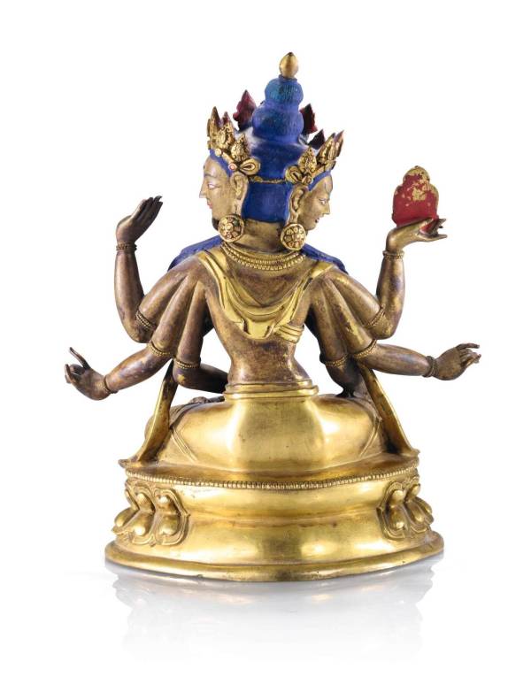 assise en vajrasana sur une double base lotiforme, les huit bras rayonnant autour du torse, les mains principales présentant un double vajra, les autres mains en mudra ou tenant des attributs, la tête à trois visages surmontée d'une couronne entourant un double chignon, scellée