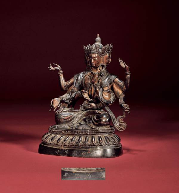 尺寸:高19.8cm 年代:清代 质地:铜 风格:乾隆 六品佛楼 来源:拍卖会 成交:276,000元(2012.06) 参阅:中国嘉德 鉴赏: “功行根本”、“尊胜佛母”、“大清乾隆年敬造”款