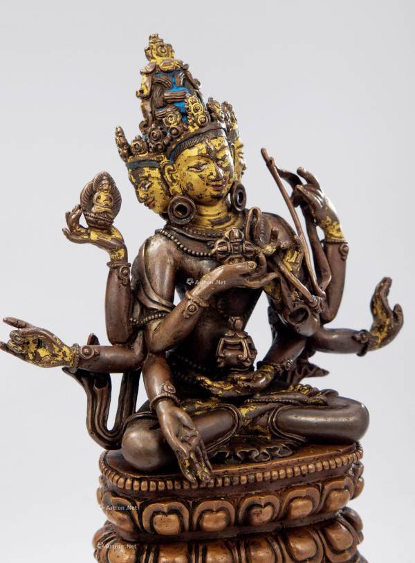 此像为清代拉萨布达拉宫脚下著名官设作坊雪堆白所造。雪堆白作坊始于五世达赖喇嘛执政时期,自明代起便代表着西藏地区手工艺最高水平,主要为布达拉宫及其周边寺庙制作佛像。雪堆白造像以做工精细、独具巧思而闻名。清中期时受乾隆皇帝喜好影响,开始摹仿古印度帕拉、尼泊尔艺术风格作品。此像明显反映出帕拉造像的艺术风格,佛母头戴宝冠,塔状发髻高耸,染绀蓝色,面上各具三眼,相容端庄圆润,于泥金上施彩绘,五官精致柔美,神态祥和静谧;呈金刚跏趺坐姿,八臂位置、手势各异,上托活佛阿弥陀佛,法器十字金刚杵、甘露寿瓶、弓等,富于动感,姿态优雅写实;佛母身形结构比例完美,配饰包括耳珰、项链、璎珞、钏镯、腰带等,工艺精巧华丽;上身袒露,下着薄裙,轻柔贴体,裙边在座面铺展开;帔帛从肩上绕臂而下,末端向上飘扬,美感尽显;莲座端庄华丽,仰覆莲瓣层叠有序,上下对称分布,束腰明显,具平衡大气之美,上缘饰饱满的连珠纹一周,下缘有多层台阶提高底座,彰显造像的尊贵地位。