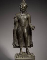 泰国堕罗钵底艺术(Dvaravati,约6-11世纪)早期作品:在泰国中部出土的6-7世纪的灰砂石或青铜佛像,具有鲜明的本地特征:宽厚的嘴唇、扁平的鼻子、卷曲的头发(仿造佛陀的螺发,但更似本地发型),以及带有神秘“古风式微笑”的圆脸。佛衣多为偏袒右肩式,衣纹简洁。这些特征与印度原型已有显著区别,是东南亚本土佛艺的重要开端。