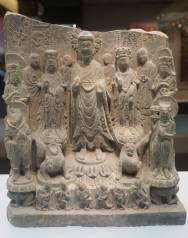 北齐青州龙兴寺窖藏佛像(6世纪中后期):1996年山东青州出土,是这场变革最震撼的例证。许多佛像采用彩绘石雕,其典型特征是:佛衣极薄贴体,不刻或浅刻衣纹,身躯轮廓毕现,被称为“曹衣出水”,明显受到印度笈多(尤其是秣菟罗)艺术的影响。同时,佛像面庞圆润,带有含蓄微笑,体现了本土审美。