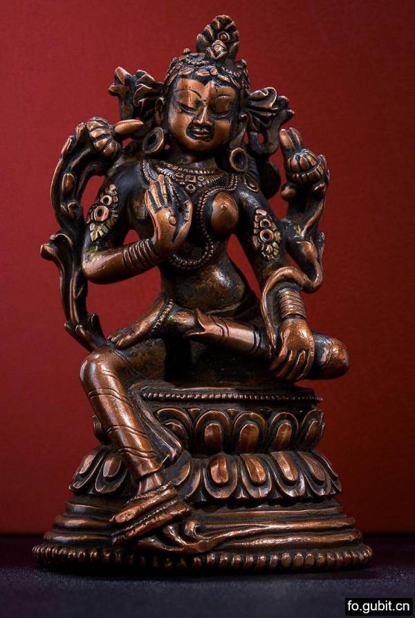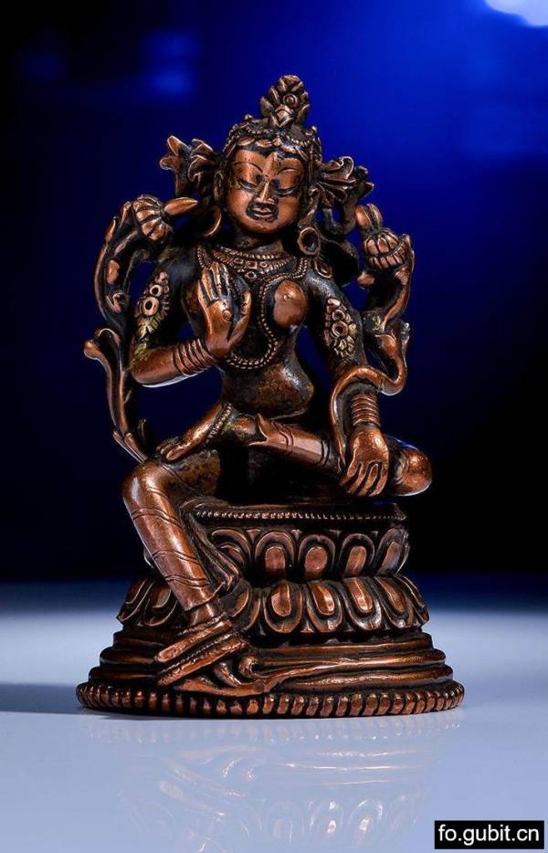 此尊绿度母面相如年轻女子,戴小三叶发冠,发髻高耸,饰髻宝,头发丝缕分明,缠束有致,自然且写实;额部饱满浑圆,有明显的弧度,颊颐丰满,鼻梁挺直,双目微睁,肃穆含笑,清丽俊秀之气盎然,突出了度母观照众生的慈悲与善良,而且慈祥的目光和那始终微笑的面容,给予众生无尽的温情,使人望之神安。上身饰联珠式项圈和长链,下身着贴体薄裙,其上的纹理如同行云流水般流畅;度母右手胸前施无畏印,左手牵一莲茎并置于右膝上,莲茎至莲台上生长而出,于手中缠绕顺臂而上,于左肩侧吐蕊盛开,造型优美,娇艳欲滴,衬托出度母的美艳与圣洁。度母头略向左偏,腰肢稍向右扭,刻划出一条优美的曲线,既展现女性的柔美,又暗示她慈悲普度的情怀;左腿横盘,右腿下探,脚踏一茎仰莲,半跏趺坐于莲花座上,坐姿挺拔端正,下有一含苞待放的花朵,好似被度母轻轻的压弯了枝头;高台束腰仰覆式双层莲花座,莲花瓣饱满立体。