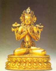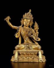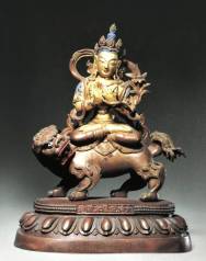 Manjushri (Tibetan: Jampalyang, Jampaiyang (rje btsun 'jam pa'i dbyangs) is a popular Buddhist figure commonly represented in art. He first arises from the Mahayana Sutra literature of Northern Buddhism where he is regarded as a bodhisattva - the bodhisattva of wisdom. In artistic depictions these forms are non-iconic in appearance which means that the iconography is not fixed. Manjushri will still have one face and two arms. His typical emblem(象征) is a Prajnaparamita sutra book(般若经书) held in the left hand or supported by a flower blossom. A sword is often held in the right hand. In art he is typically depicted in a relaxed posture, in front of a temple or portrayed in narrative settings.