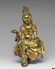 文殊菩萨又称文殊师利, 曼殊室利, 法王子, 梵文Manjushri. 文殊菩萨是大智慧的象征, 常与普贤菩萨同为释迦牟尼佛左右胁侍, 共同彰显佛陀的“智”与“行”, 世称“华严三圣”。其形象通常右手高举燃烧的智慧剑,斩断一切无明与烦恼;左手持般若经卷,代表至高无上的圆满智慧。常以威猛青狮为坐骑,狮吼寓意以智慧之音惊醒沉迷众生。独特的五髻宝冠,象征五种如来智慧。文殊菩萨的形象众多, 具体请参看下面的文殊菩萨造像特征。