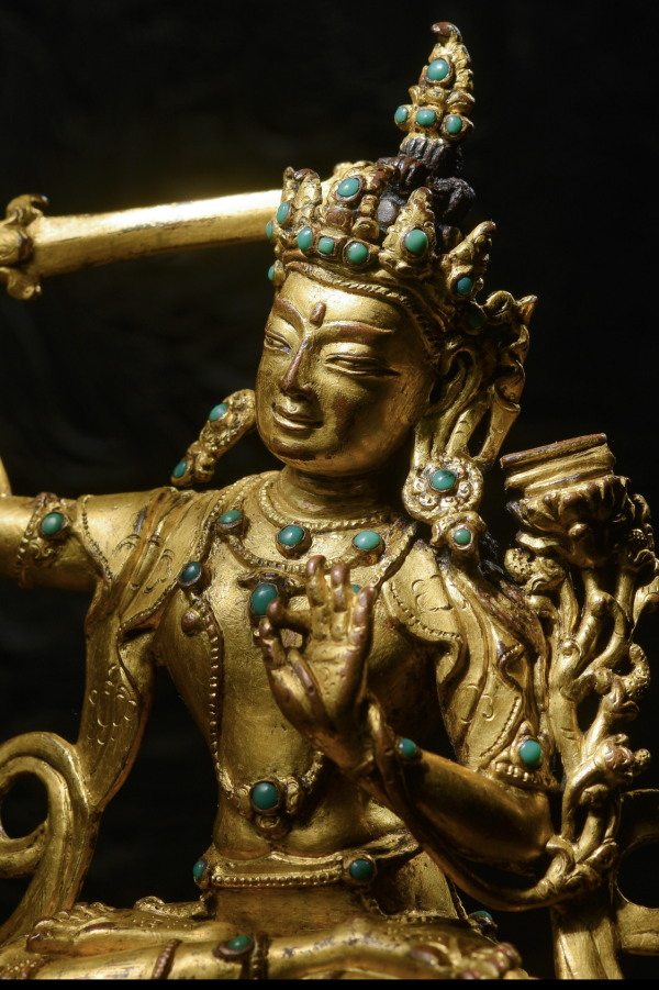 此尊文殊菩萨束高发髻,上又摩尼宝装饰,佩戴宝冠,冠叶高耸宽大,其上并满满镶嵌宝石。耳侧缯带呈U字形飞扬,耳挂大圆珰,发带扎成一辫垂于左肩。菩萨额头宽广,面相圆润,眉间饰白毫,低垂的双眸和微笑的嘴角,流露出其悲天悯人的情怀,让迷茫中的众生心生无限的信心和希望,足显慈悲祥和!菩萨躯体比例匀称,肢体饱满而富有弹性,姿态非常自然,不过这也反映了此时期造像高超的艺术技巧!上身袒露,披着的天衣锦帛于肩头落下,垂于莲台两侧,十分连贯飘逸,极大的表现出丝制品的柔软质感。菩萨腰部收束,颈挂项链璎珞,胸前饰长链,四肢皆有钏环,并且通身配饰上皆镶嵌有绿松石,十分华丽典雅!其下贴体的长裙,在连珠纹的点缀下显得十分流畅华丽,质感较强,生动表现出僧裙向内收起的自然状态,尤为优美大方!