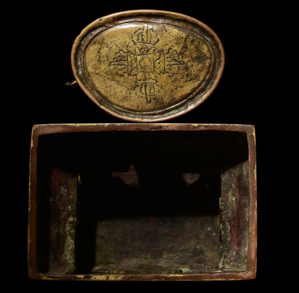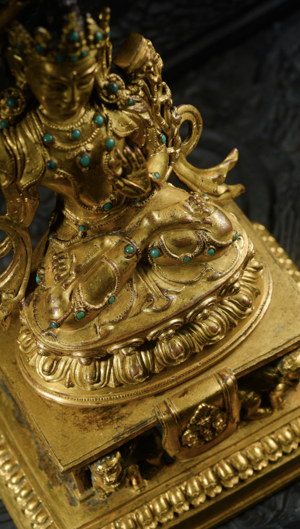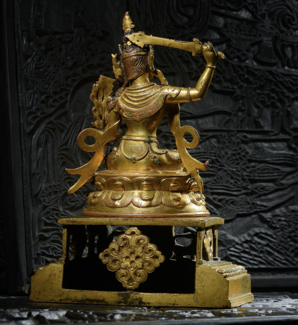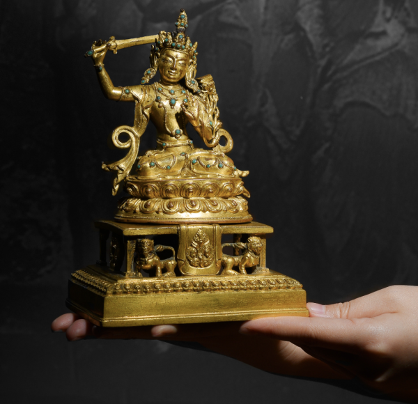 文殊菩萨双腿结跏趺娴静端坐于莲台之上,右手持剑,横断上空,象征智慧之剑斩断一切执著和缠缚,左手于胸前拈一支乌巴拉花之茎部,延伸到左耳边之花上有代表般若经之经箧,象征所有智慧来自般若经典。此剑剑首嵌松石,剑阁如花朵,剑刃如烈焰。而乌巴拉花枝干全部镂空,蜿蜒向上,充满生命力。仔细看,真的在小小的细节处就彰显了整尊工艺的精美。其下束腰仰覆式莲花宝座,莲瓣排列十分整齐,正面瓣尖饱满有力,微微翘起,制作精当,背面莲瓣大气舒展,极具张力,似乎涌动着生命的脉博!其精致与讲究,远非一般可比。莲座下有完好的装藏,严实的包底牢固而有效地护卫着内膛的装藏,使其继续保有神秘的宗教灵性与加持法力,非常适合自己供奉。为了让这尊造像更加庄重,特意搭配一尊17世纪的尼泊尔铜鎏金金刚座,此座下为镂空雕刻的立式回廊,两头狮子将金刚座奋力托起。中间垂下的帷幔上阳刻着精美的缠枝纹,四周还有多种图腾装饰,这种带写实风格的台座形式,可以使人联想到尼泊尔现存的大型寺庙建筑和石窟的回廊,特别是立柱的风格可以到古罗马建筑风格对印度的影响。金刚座下方有一圈细腻莲花瓣,制作小巧精致,具有浓郁的尼泊尔造像艺术风格。