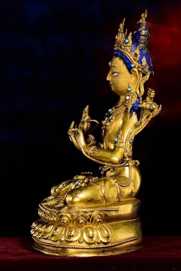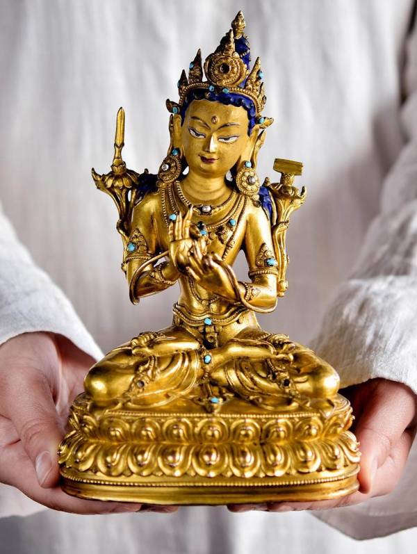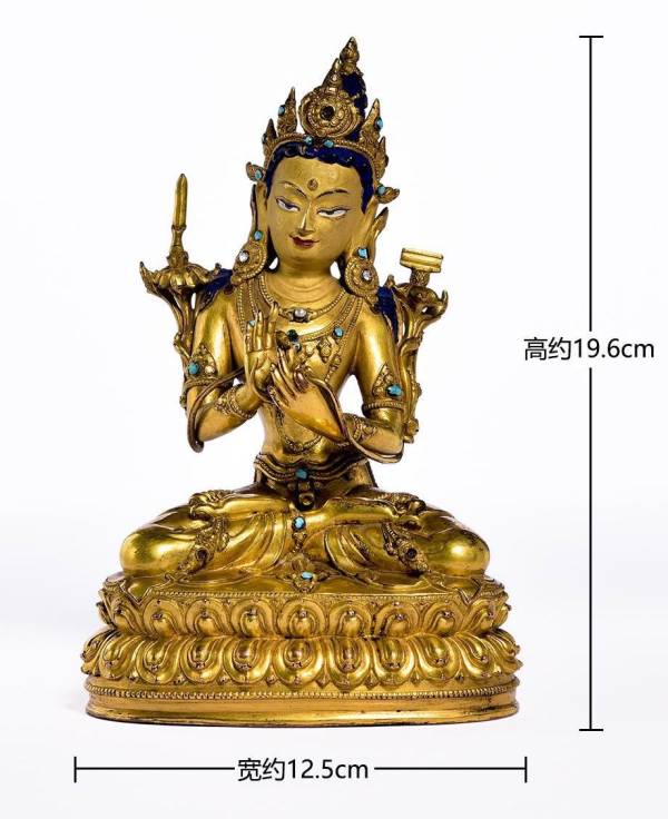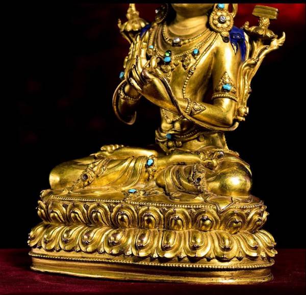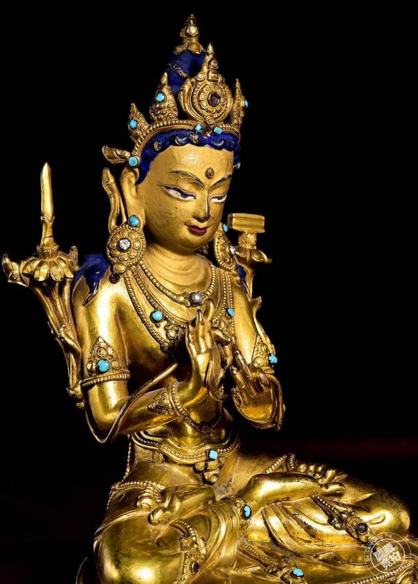 整体而言,此尊文殊菩萨可谓造型典雅,法相庄严,装饰精细奢华,工艺精湛,体量较大,品相一流,充分展现了15世纪初西藏中部地区佛教造像的工艺特点与艺术风采。自索南坚赞风格的确立以来,市场对其追捧愈发火热,每每出现在市场都能吸引众多藏家争相竞逐。本次龘藏所隆重推出的索南坚赞风格文殊菩萨像,不仅有着重要的艺术和收藏价值,而且有着极高的宗教价值,对于信仰者来说,是难得一见的供奉佳品。对于收藏家来说,亦是风格明确难得一遇的尊胜妙宝。