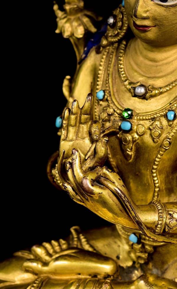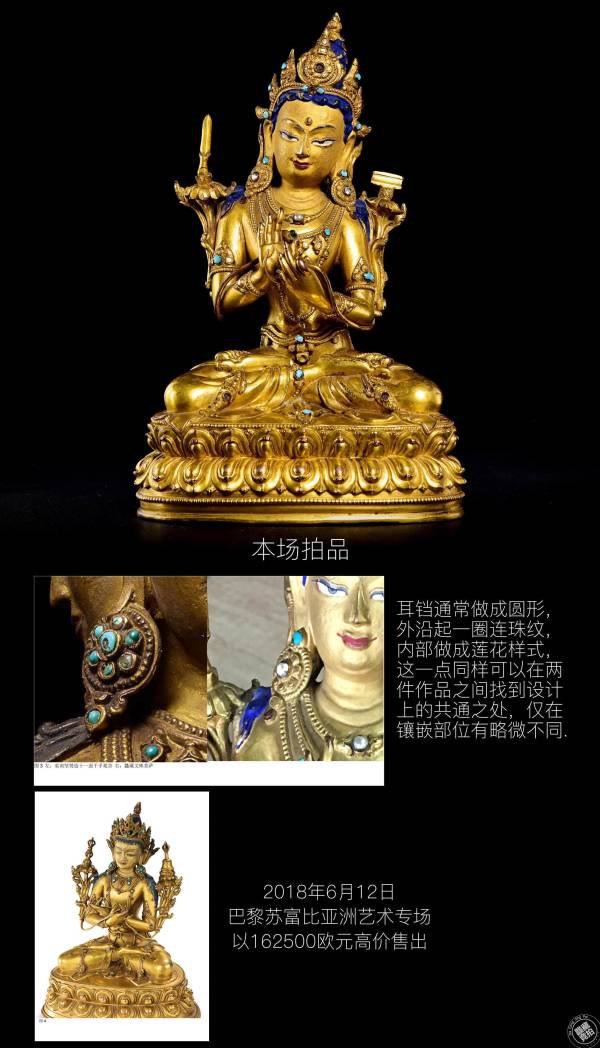 索南坚赞善于使用独特而精细的方式对造像身上的镶嵌物和璎珞进行处理。镶嵌位置十分多样,时常出现在头冠、耳铛、臂钏、璎珞等部位,每块镶嵌石均被精准的切割成圆形或水滴形,装饰效果华丽。最具辨识度的一个细节是对璎珞造型的刻画。网状的璎珞多在菩萨围裙处自然垂下三缕连珠,两腿之间及双腿各一条,璎珞末端做成花苞的样式并进行镶嵌。这一设计在索南坚赞风格作品中无论立像或坐像中均能找到相似的表达。除本例文殊菩萨外,另参考一例铜鎏金金刚总持,后者于2018年6月12日巴黎苏富比亚洲艺术专场以162500欧元高价售出(图4)。从此案例中可以看到,尽管三件作品的题材与尺寸不同,然而在整体风格及细节方面高度一致,尤其是造像的莲瓣造型、面部刻画、以及璎珞的样式和镶嵌位置等区域的处理手法,明显师承一脉。