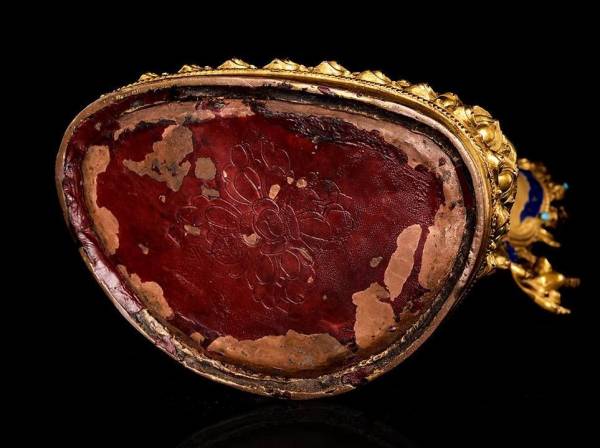 此尊文殊菩萨为并不多见的法说形象,文殊菩萨头戴五花冠,正面中央花瓣如一颗硕大的摩尼宝,周围四片冠叶镶嵌宝石,细节彰显工艺之精美;头顶束高发髻,髻顶摩尼宝,余发披于两肩和后背;耳侧缯带弯曲上扬,耳垂花形耳当。菩萨面部有泥金,其额头宽广,面相圆润,眉目清秀,眉间饰白毫。低垂的双目和微笑的嘴角,流露出其悲天悯人的情怀,让迷茫中的众生心生无限的信心和希望。双肩宽厚,腰部收束,躯体柔软,肌肉饱满。上身饰项圈及璎珞。背部处理精妙绝伦,菩萨长发披流而下梳成三份,发丝刻画柔软而飘逸,中央一束垂发自然贴体穿过第三根项链;工匠对背部的肌理把握精准,肩背刻画细腻富有厚实感,自上而下的优美线条勾勒出婀娜的腰肢与饱满的臀线。下身着长裙,衣纹裙轻薄贴体,质感较强,特别是腿部衣纹呈对称状密集分布,生动表现出僧裙向内收起的自然状态,尤为优美大方,叫人叹绝。菩萨四肢有钏环装饰,并且通身配饰皆嵌绿松石,十分华丽。菩萨娴静端庄自然坐于莲台之上,望顾生悲,安人心灵,两手置于胸前结说法印,手心各牵一莲茎,左右肩花上分别安置经书和宝剑。经书和宝剑是文殊菩萨形象的重要标识,利剑表示可以斩杀一切烦恼,经书表示智慧渊博如同三藏。仰覆束腰式莲座,稳重大气。上下边缘各饰一周连珠纹,莲瓣秀长,挺拔饱满,打磨光滑制作精致,饱满的莲瓣极具张力,似乎涌动着生命的脉博。封底保存完好,底板上的十字金刚杵牢牢的护卫着内堂里的装藏。此尊文殊菩萨以黄铜铸造,胎体厚重,铜质细腻温润,包浆古朴润泽,表面的鎏金历经近六百年的传世依然璀璨夺目。