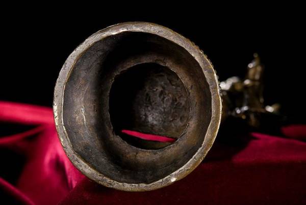 菩萨开脸俊美,头戴早期三叶宝冠,发髻高耸,衣裙轻薄贴身,以腰带收紧于髋部,坠于腿间,胶丝式僧带斜挎胸前,项链简洁大方,底座圆雕双层仰复式宽叶莲瓣,莲座下部整齐连珠纹落地,早期风格明显。分布在腿部的阴刻线条纹饰尽管只有寥寥数笔之刻痕,但怡是这种简洁表现岀衣裙轻薄之美的特质,若有若无之间,魅力尽显,已知的古格举剑文殊立像馆藏品极少,体量大的更少。首博著录《慈悲的容颜》一书可供参考。