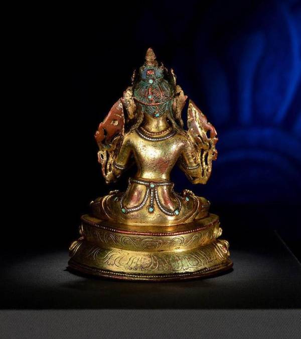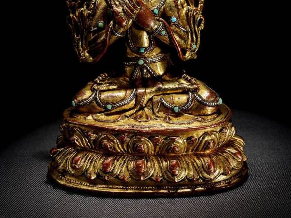 “菩萨头束高发髻,并佩戴宝冠,冠叶高耸宽大,在正面中央花瓣上还呈现出优美的弧度,并满满镶嵌宝石,越仔细看与发现,好的造像真的是在小小的细节处就可彰显处整尊工艺的精美!菩萨额头宽广,面相圆润,眉间饰白毫,低垂的双眸和微笑的嘴角,流露出其悲天悯人的情怀,让迷茫中的众生心生无限的信心和希望,足显慈悲祥和!菩萨躯体比例匀称,肢体饱满而富有弹性,姿态非常自然,极尽地反映了此时期造像高超的艺术技巧!上身袒露,腰部收束,耳挂圆珰,颈挂项链璎珞,胸前饰长链,四肢皆有钏环,不难发现,此尊造像的珠串璎珞均为银质,颗颗银珠典雅精致,其上并且还镶嵌了松石,十分华丽典雅!红铜、鎏金、纯银、松石四色的碰撞,显得整件菩萨装十分流畅华丽,质感较强,生动表现出僧裙向内收起的自然状态,尤为优美大方!文殊菩萨双腿结跏趺娴静端坐于莲台之上,双手置于胸前结说法印,望顾生悲,安人心灵!身体两侧各有一花茎,并有花朵盛开于左右双肩,上面各放置经书和智慧剑,利剑表示可以斩杀一切烦恼,经书表示智慧渊博如同三藏,不过这也是文殊菩萨形象的重要标识!其下束腰仰覆式莲花宝座,莲瓣层次感极强,上下对称排列十分整齐,瓣尖饱满有力,微微翘起,制作精当,极具张力,似乎涌动着生命的脉博!背面,莲瓣则采用阴刻的手法,洒脱的线条更是把整件造像的精美度推向了高潮!在台座的上下边缘还伴有连珠纹,十分精美!”