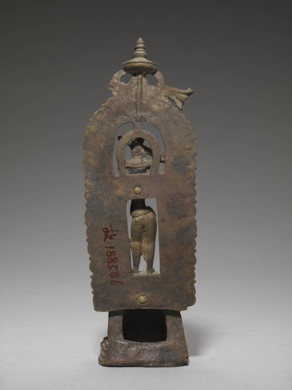 This statue of the bodhisattva Mañjuśrī (or Manjushri) is made of brass. Wearing a skirt-like garment, the figure has a gilded face and is adorned with a bejeweled crown, necklace, and bracelets. The bodhisattva has broad shoulders, a slender waist, and a bare upper torso. Raising a sword high above his head with his right hand, he twirls the stem of a lotus in his left. The lotus serves as a support for a sutra. The figure’s feet rest upon a round pedestal, which is supported by a large blooming lotus and a square plinth that features two lions on the front panel. Behind the bodhisattva is an upside-down U-shaped nimbus with a flame pattern that is topped with a canopy. The figure’s slender body is characteristic of early Western Tibetan statues.