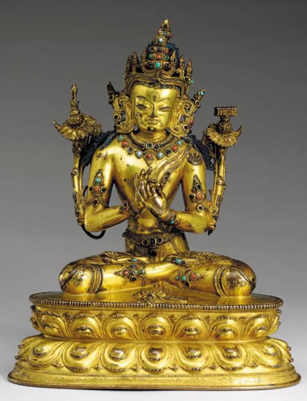 Finely cast seated in dhyanasana over a lotus base with molded tips, incised foliate scroll border and beaded rims, his hands in the gesture of teaching flanked by two lotus stalks supporting his attributes of the sword and book, his left shoulder wearing a sash snaking across his chest with delicate foliate borders, his dhoti with linear folds and incised foliate motif, cinched by a beaded belt with overhanging lappets at rear, adorned with elaborate necklaces, diadem, armlets, bracelets, and anklets inlaid with various hardstones, his head slightly tipped to the left in a benevolent expression with delicately arched brows under lidded eyes and mouth in a slight smile, his hair arranged in a high chignon topped by a jeweled cintamani with loose strands falling over his shoulders, base sealed