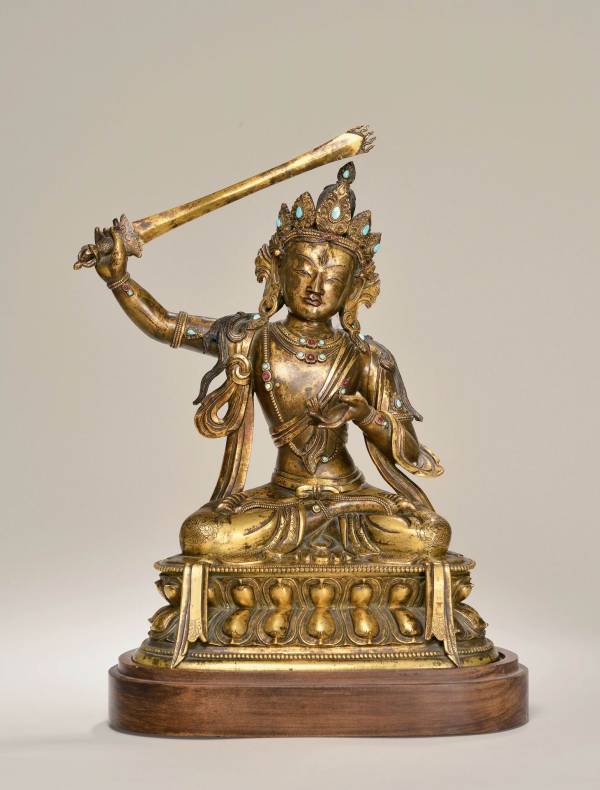 菩萨束发高髻,头戴五叶宝冠,冠叶上嵌有绿松石,面相庄严,眉眼细长,嘴唇微闭,面容寂静,显现洞悉一切的般若大智能。身体略向右边倚斜,姿势优美,上身袒露,胸前饰璎珞,左手当胸结说法印,右手高持一把宝剑举于头顶,宝剑与经书是文殊菩萨的重要标识;身披帔帛,于右肩打结,自然垂落并于莲座边自然垂下,菩萨下着长裙,衣薄贴身,全跏趺坐于莲花宝座上,莲座为双层束腰仰覆莲座,莲瓣扁平,座前饰有两条飘带,上下各缘饰连珠纹一周。菩萨的、臂、脚及脚踝处皆饰钏环,宝冠及钏环皆嵌宝石,尽显富丽华贵之美。整体造型严谨,体谅硕大,鎏金富丽,具有宫廷造像工艺特点。