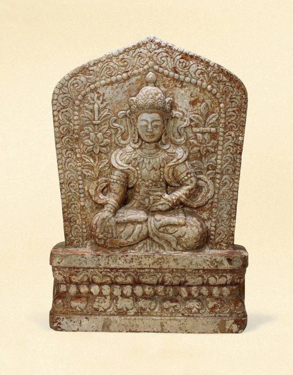 此尊与之文殊菩萨石造像以青石为材,髹朱漆,朱漆大面积剥落,然雕刻的细节则更加完整的呈现出来。文殊采用高浮雕的手法,面容饱满,眉如弯月,头戴宝冠,缯带外飘,飘带如清代造像的服饰仪轨一般飘于体侧,颈部着项饰,下身着群,结全跏趺坐与仰覆莲台之上。莲台高束腰,束腰处装饰联珠,上下莲瓣扁平,瓣尖上翘,刻画的细致入微。背光处装饰蔓草及联珠纹,文殊的所执的莲花上托剑与梵筴自然铺开于背光之上,如繁花盛开之地,观之如有香气袭来。
