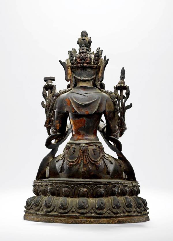 此尊菩萨像,在头部花冠刻画、面部表情、颈间腰后的U型缨络纹饰以及座下深束腰双层莲花底座等细节之处的处理手法和艺术风格,均带有比较明显的永宣造像遗风,座后底边上阴刻捐造人的款识,「甲子年善人牛斍贞」款,综合造像的铜质、风格、细节表现等信息,此像应为明正统九年(1444年)所制。
