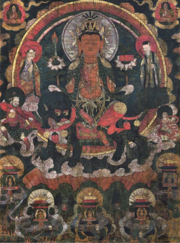 年初,拜读荣新江先生的大作《敦煌新样文殊与大唐五台山》,使我想起了去年10月份在香港亚洲艺术节上看到的一幅文殊菩萨唐卡。荣先生的大作以“新样文殊”为考察重点,详细考证了它的来历、图像形式及特征,与笔者看到的文殊菩萨唐卡上的文殊图像完全一致,为认识文殊菩萨唐卡内容提供了重要依据和线索。机缘巧合,现在香港亚洲艺术节上的文殊菩萨唐卡又现身今年中贸秋季拍卖会上,借助荣先生的研究成果,我们终于可以解读此幅唐卡内容,识得其庐山真面目。