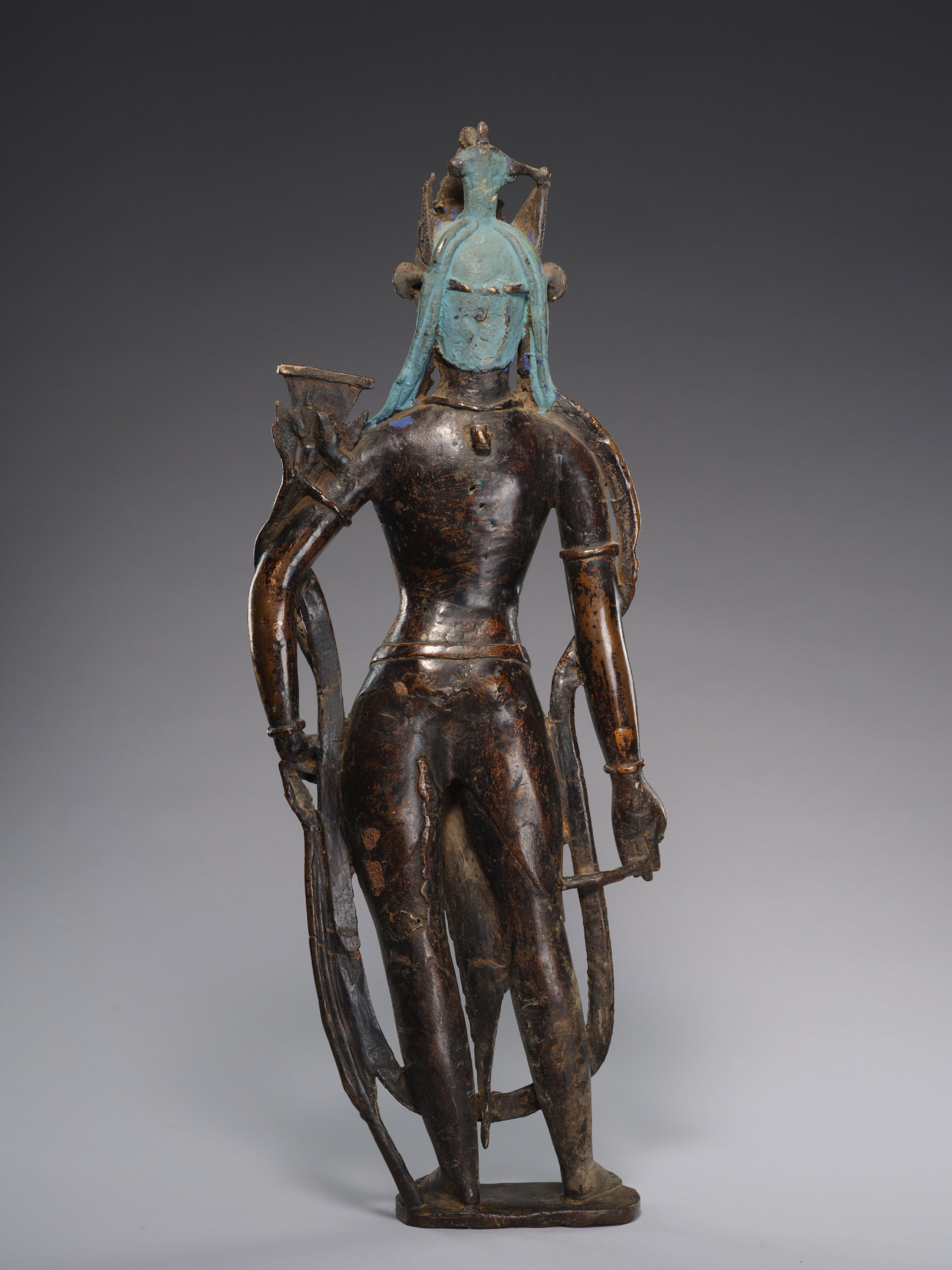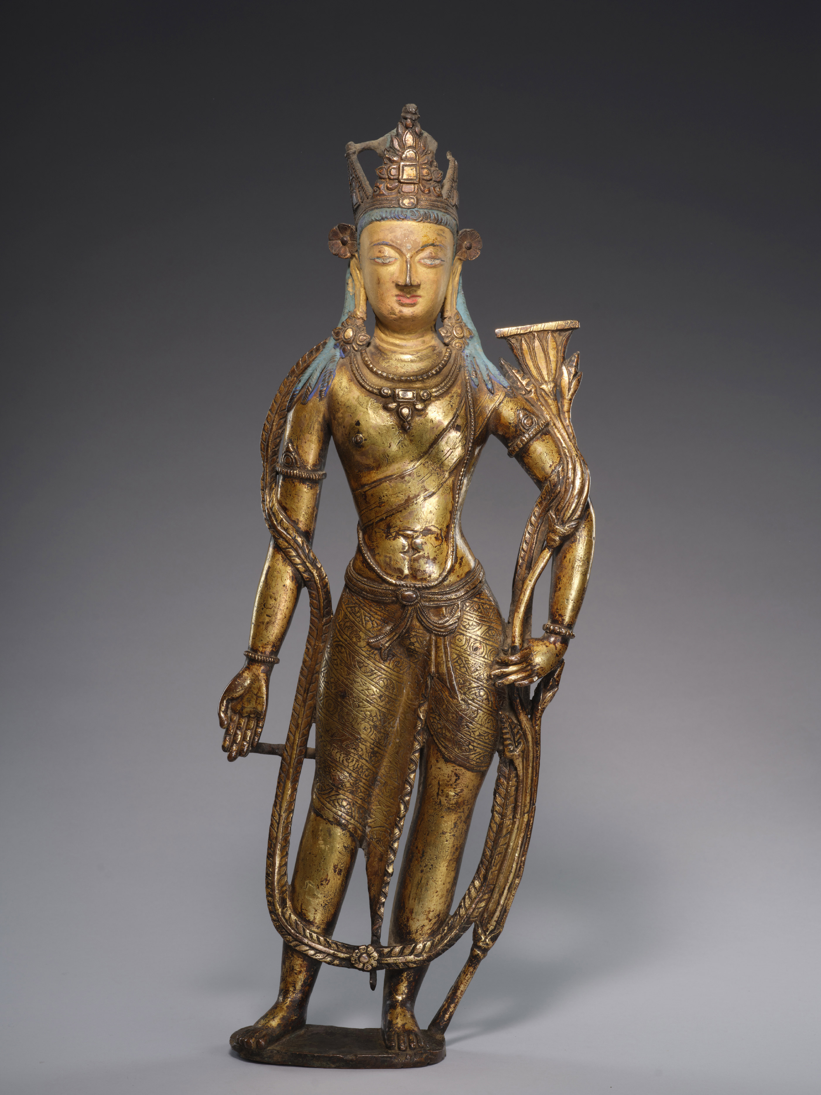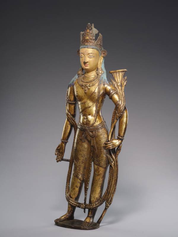 裙子刻繁密的花纹以及花鬘的做法见于克什米尔晚期和西藏西部早期造像中尤其在西部早期造像中更常见,与诺顿·西蒙博物馆所藏一件莲花手观音像特征极为相近,同为古代喜马拉雅西部的作品。