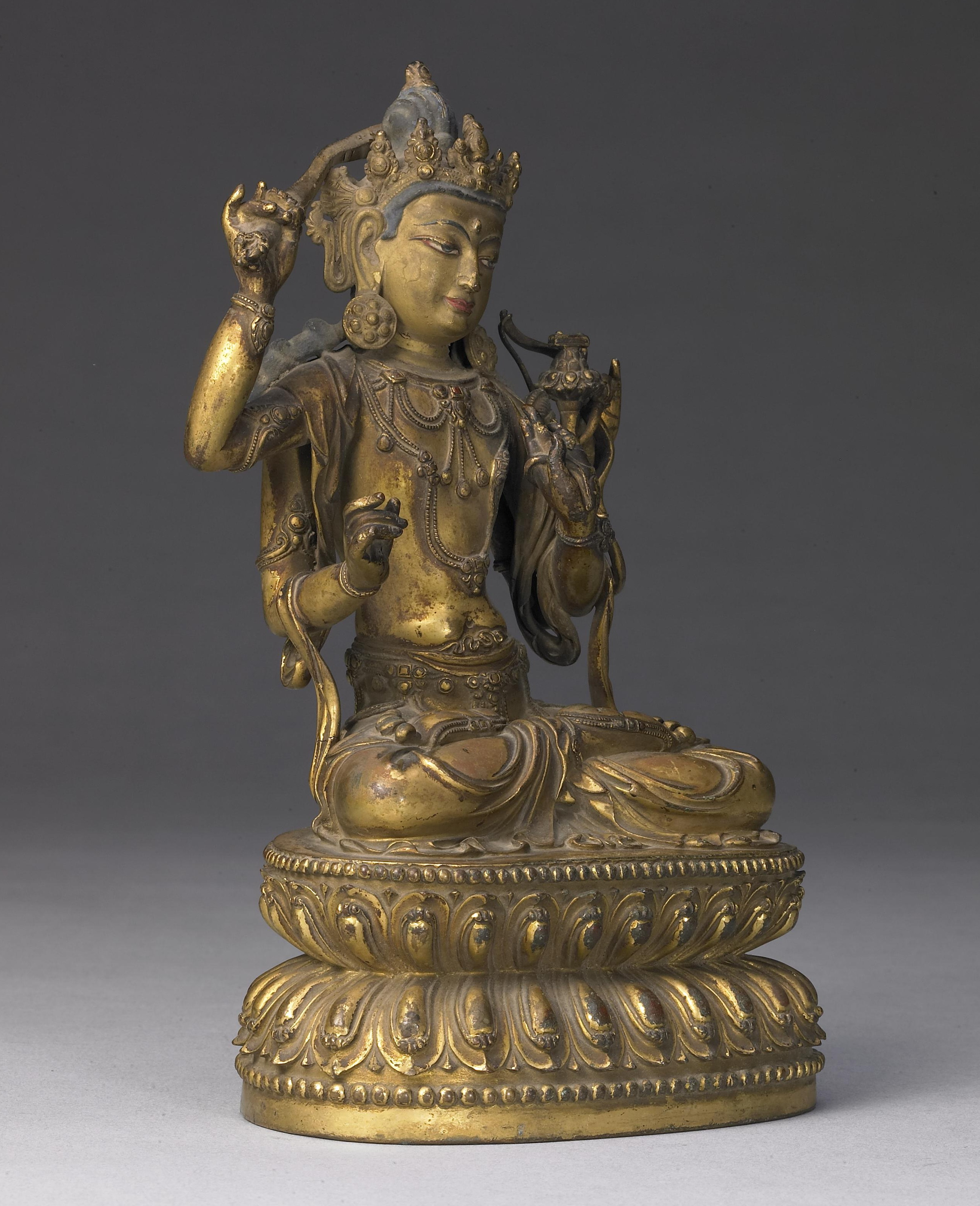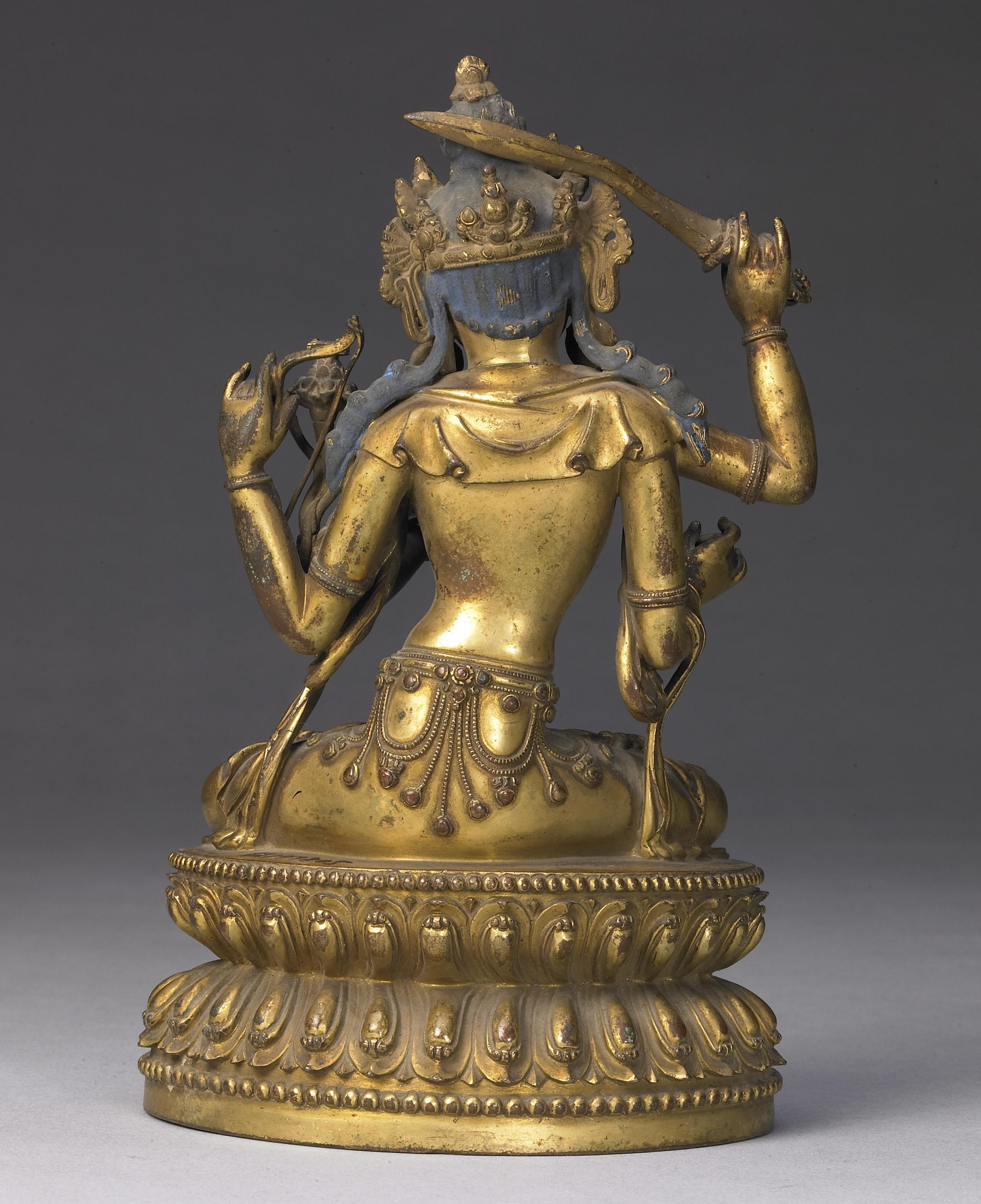 文殊菩萨坐像一头四臂,面相浑圆秀美,垂目俯视,神态安详。头戴五叶宝冠,袒上身,细腰束裙,褶纹转折自如,起伏流畅,潇洒飘逸。主臂右手上举持剑,左手结期克印牵莲花茎,另外两手右手持箭,左手上举持弓,全跏趺坐。端坐于仰覆莲座,莲瓣细长挺拔,上下边缘饰联珠纹。座面阴刻“大明永乐年施”楷书款。