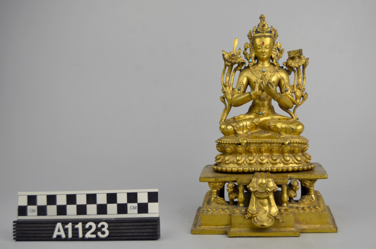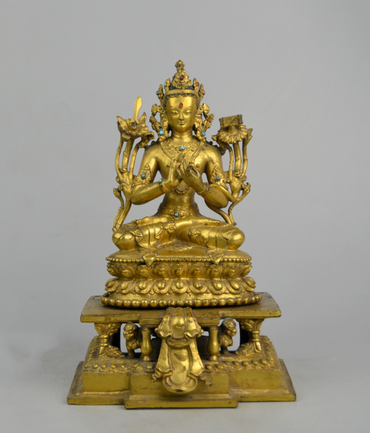 Gilt bronze Manjusri with turquoise inlay. Manjusri, the bodhisattva of wisdom, is flanked by two lotus stalks which hold his attributes of a sword and a sutra. He is seated on a lotus on an oblong dais (two parts). The halo that attaches to the throne is missing.