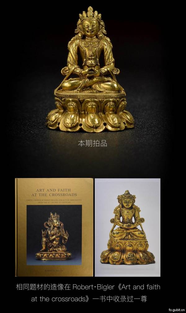 参阅: 1、 瑞士著名收藏家Robert·Bigler《Art and faith at the crossroads》一书中收录过一尊长寿佛与此件拍品同为一批,第94-95页。 2、2017年香港苏富比春拍一尊明永乐至宣德铜鎏金绿度母坐像与此件拍品同为一批。 3、巴黎佳士得2019年春拍,明永乐 鎏金铜观音及佛母坐像,LOT208,成交价:910,000欧元(含佣金约合人民币750多万元)。再一次证明宮廷御制、精品、题材收藏方向永 远是王道!!那么龘藏这尊高度仅4.4公分的永乐宫廷造像能创造什么奇迹呢?让我们拭目以待…(图四)