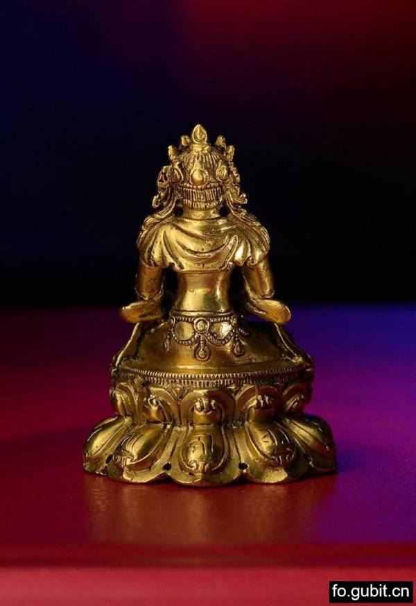 此尊造像很好地诠释了明宫廷造像优雅的美学修养和高超的艺术水平。尺寸非常小,却准确表现了无量寿佛的神态,是一尊标准的“极小版”永乐宫廷造像。无量寿佛头戴花冠,花冠前后均饰细雕冠叶,前后共八片冠叶,顶结高发髻,耳侧缯带呈U字形翻卷,耳下垂圆环。面相方圆,长眉细目,嘴角上扬,笑意盎然。双肩宽厚,腰部紧收,躯体柔软,肌肉饱满有张力。上身饰项圈和长链,项圈下缀U字形连珠式璎珞,下身着长裙,采用了汉地写实性手法,小腿部的裙褶呈椭圆形,这是永宣宫廷造像的常用表现手法。腰间束宝带,前后腰带下亦有U字形连珠式璎珞装饰,双肩披大帔帛,飘带顺臂蜿蜒而下,绕过两手腕对称搭于身体两侧。手和足部有钏镯装饰。帔帛亦采用写实手法表现,衣纹流畅优美,生动表现出丝织物飘逸的质感。结跏跌坐于双层束腰莲花宝座上,双手置腹前结禅定印,手心托长寿宝瓶。莲座特征较为明显,莲瓣秀丽挺拔,周匝一周,瓣尖以三连翻卷成花蕊状,在每一个下层莲瓣上刻有扎兰体书写的梵文,应为无量寿佛心咒。莲瓣之间还有孔洞相连,应是固定在坛城或者法冠上之用。相同题材的造像在Robert·Bigler《Art and faith at the crossroads》一书中收录过一尊(图一、图二),2017年香港苏富比春拍上有一尊明永乐至宣德鎏金铜随身绿度母坐像(图三)也与本尊无量寿佛相似,这两尊造像尺寸都是4.4厘米,莲瓣都刻有心咒,但是龘藏的这尊无论是从保存状态还是工艺的精细度都要更胜一筹。