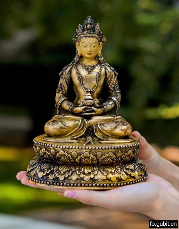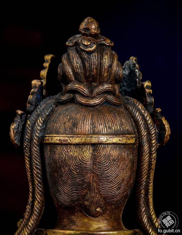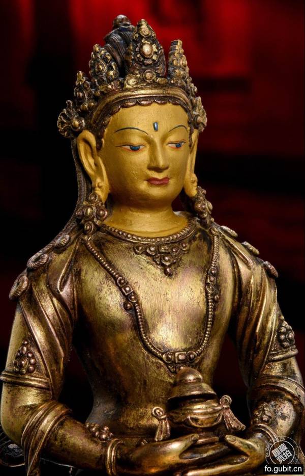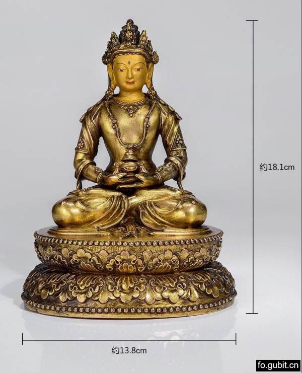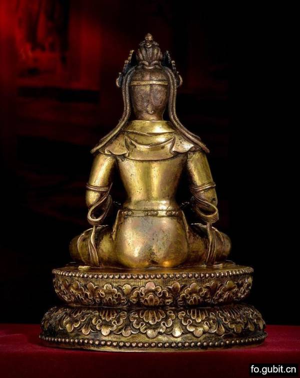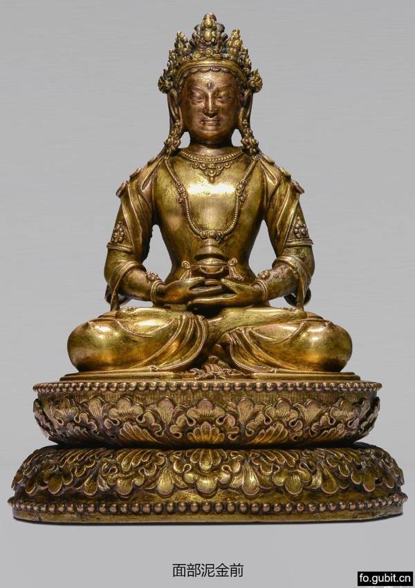 此像头戴五花冠,头顶束山形高发髻,余发分搭于双肩,大耳齐垂,耳下坠大耳珰,面形小巧圆润,相容静穆秀丽,五官刻画细腻生动。胸部高挺,腰部收束,全身结构匀称。上身饰项圈和长链,双肩披大帔帛,下身着长裙,腰间束宝带,手和足部饰有钏躅。僧裙和帔帛采取写实手法表现,衣纹流畅自然,优美大方。结跏跌坐于双层莲花宝座上,双手置脐下结定印,手心托长寿宝瓶。莲座造型规范,上下边缘各饰一周连珠纹,莲花形制独特,如盛开的花瓣一样上下对称,周匝环绕,极富装饰性。整像造型大方,结构严谨,法相庄严,装饰得体,工艺精细,是一尊十分难得的佛像艺术佳作。