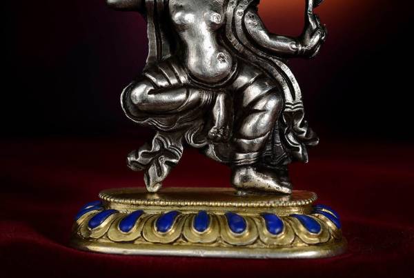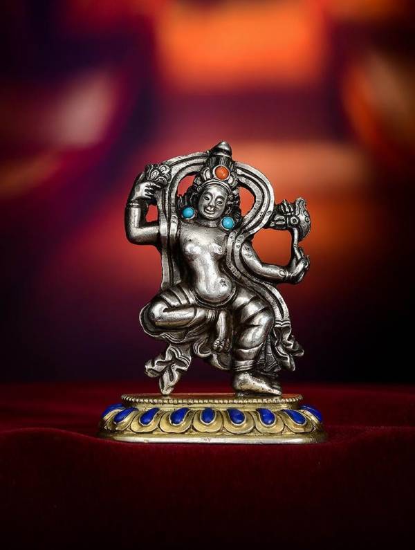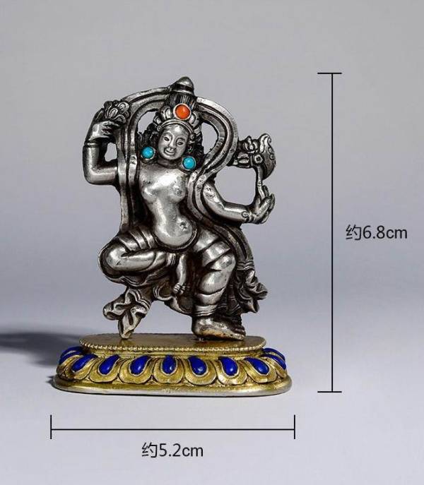 本尊为非常罕见的银质空行母造像,整体呈舞立姿,束发挽髻,并饰宝冠,面相从容温和;其上身裸露,双乳浑圆,双臂高举,一手握钺刀,一手持枝叶,增带自脑后绕于双肩,自身体两侧垂下,好似背光,极大的提升了主尊的气势的威严!右腿弯曲悬空,左腿微躬,造型十分优美,也充分展现了女性的阴柔之美!下承鎏金莲花底座,莲瓣修长饱满,并做了宝石镶嵌,奢华精美!整件随身造像工艺严谨、刀工细腻、线条流畅,并在保持整体传统风格的基础上有创新,特别是本件材质上的应用,银和鎏金的碰撞,加上宝石的镶嵌,真真具有浓厚的罗布林卡风格,宫廷气十足!加之保存如此完好,堪为雅俗共赏之随身尚品之作!
